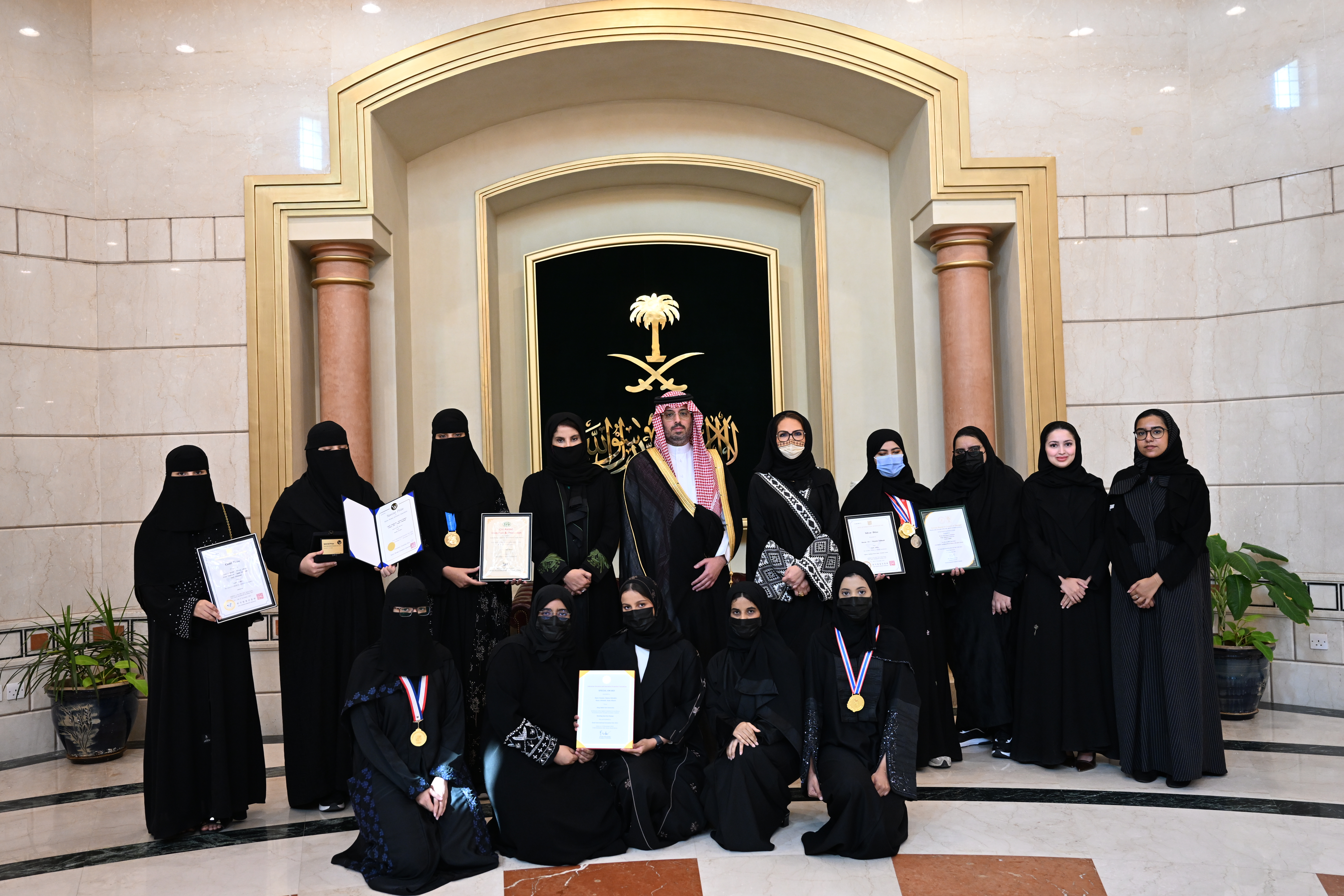 استقبل صاحب السمو الأمير سعود بن عبدالله بن جلوي محافظ جدة، في مكتبه اليوم، طالبات جامعة الملك عبدالعزيز الحاصلات على 39 ميدالية وجائزة عالمية في معرض سيؤول الدولي للاختراعات بكوريا، بحضور رئيسة الجامعة المكلفة الدكتورة هناء بنت عبدالله النعيم.