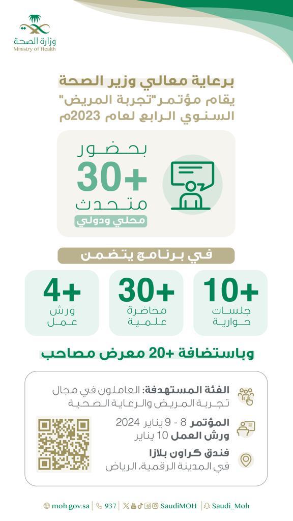 من منطلق تحسين "تجربة المريض"، يرعى معالي وزير الصحة، فهد الجلاجل، المؤتمر السنوي الرابع للتميز في تجربة العميل، وذلك ابتدًاء من يوم ٨ يناير ولمدة ٣ أيام.
