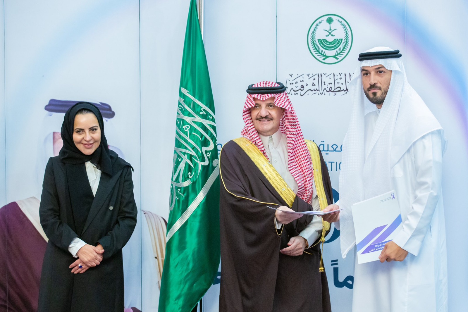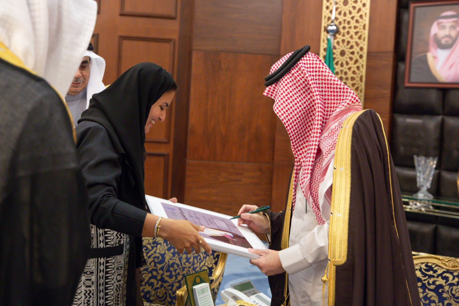 وتسلم سمو أمير المنطقة الشرقية لوحة تذكارية من صاحبة فكرة إنشاء جمعية السرطان السعودية بالمنطقة الشرقية ياسمين يعقوب الخواشكي.