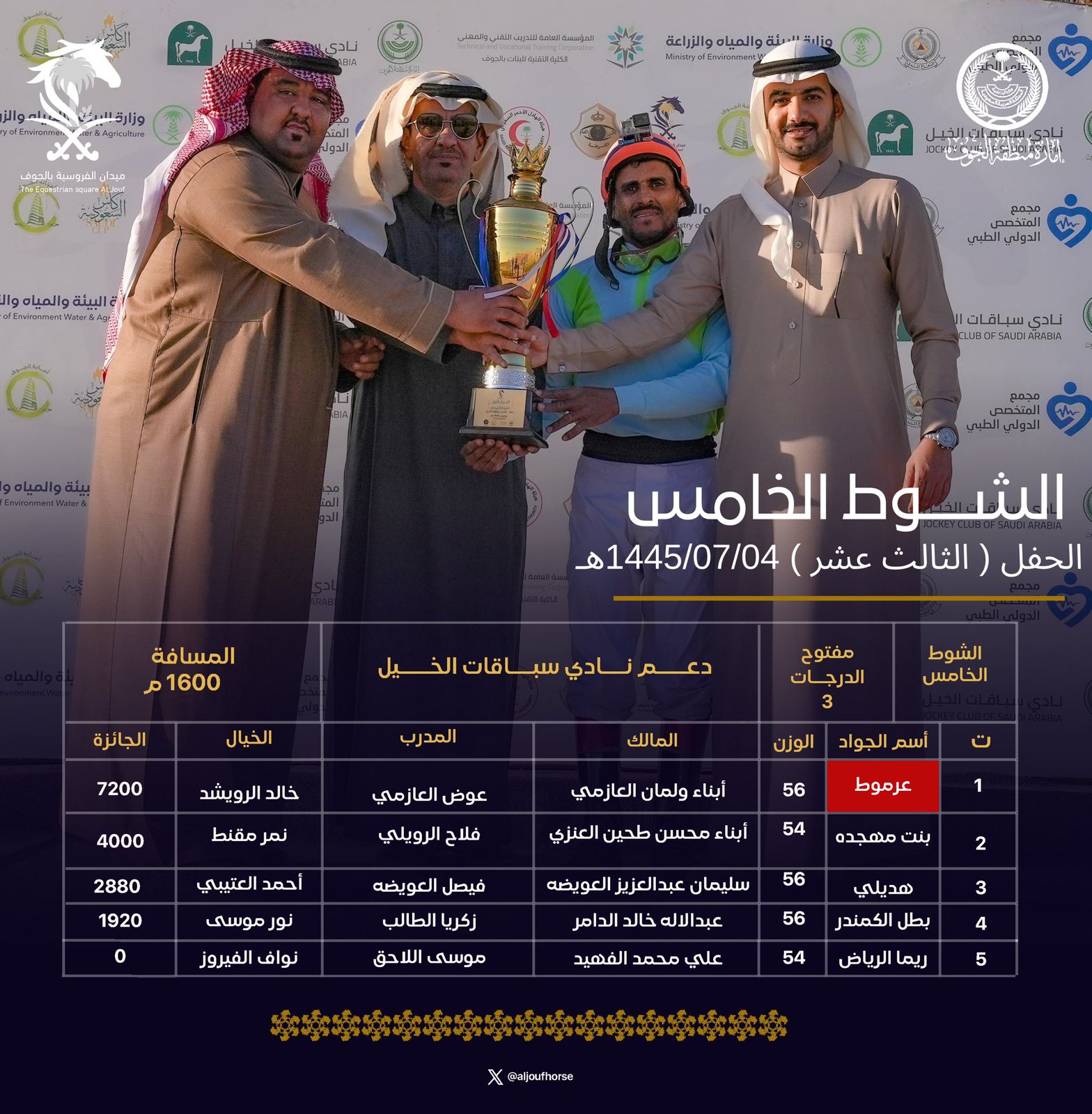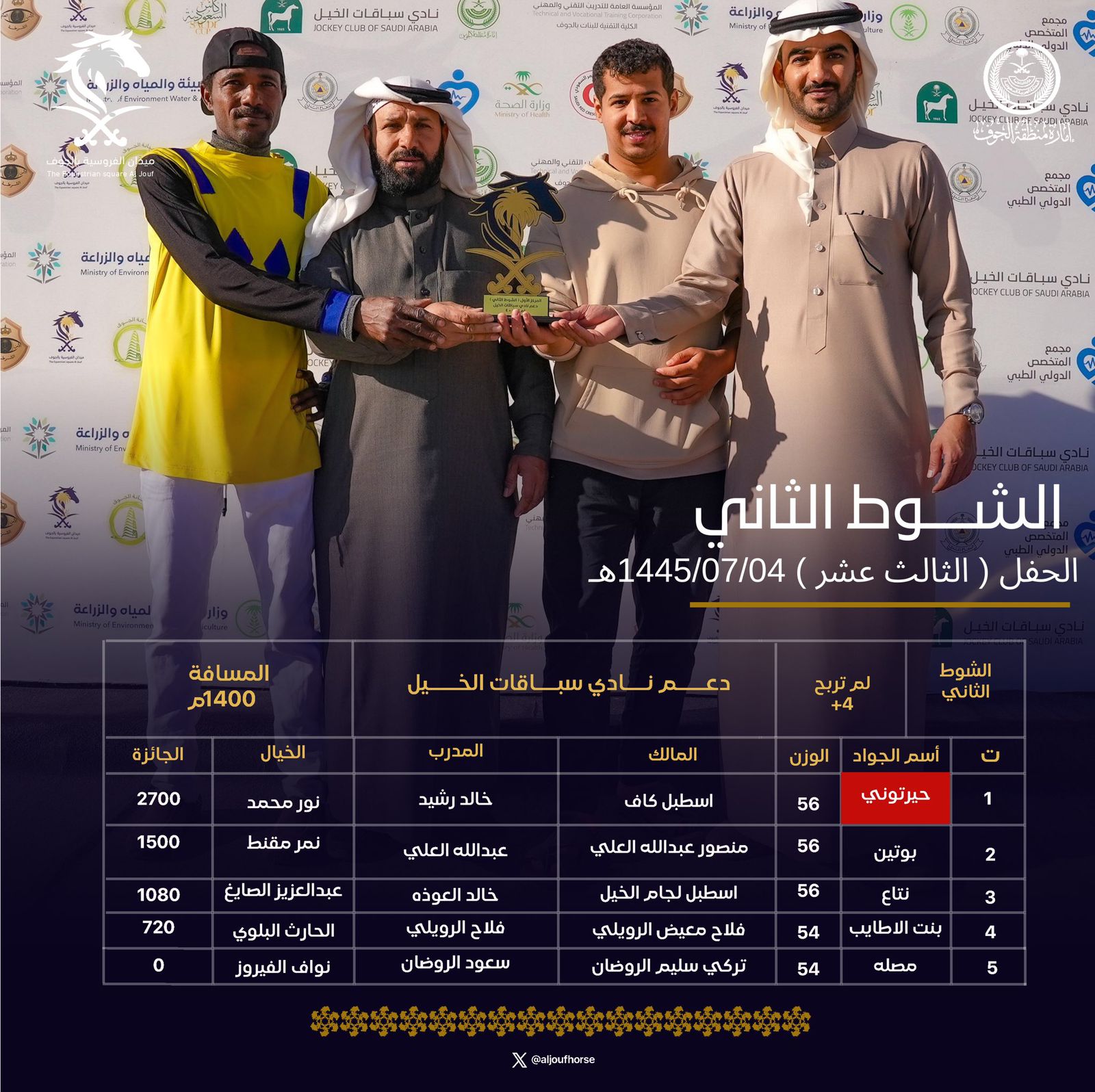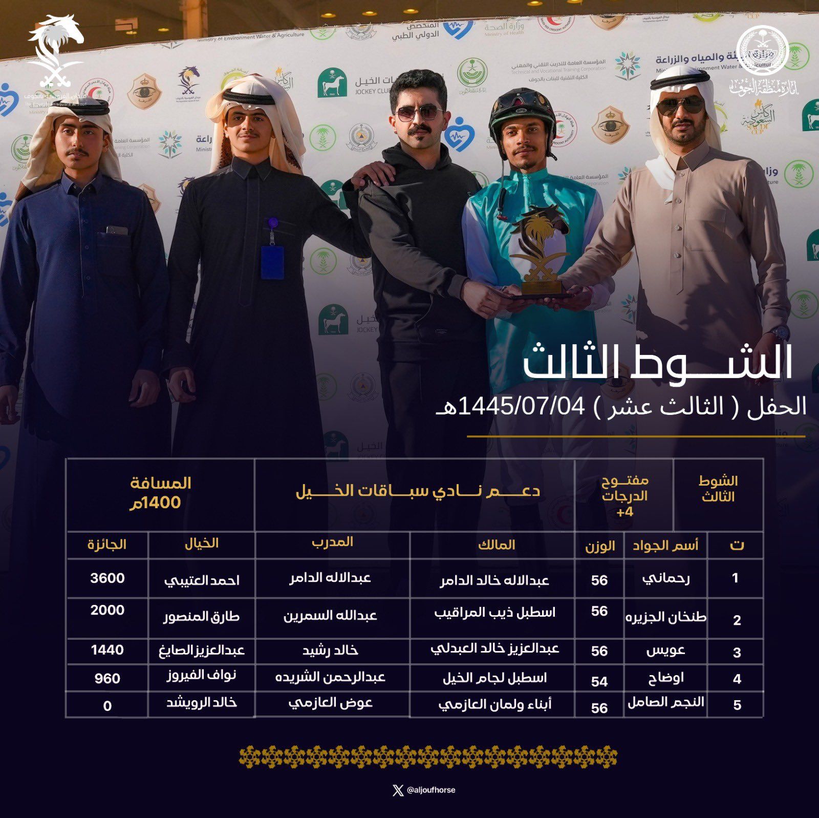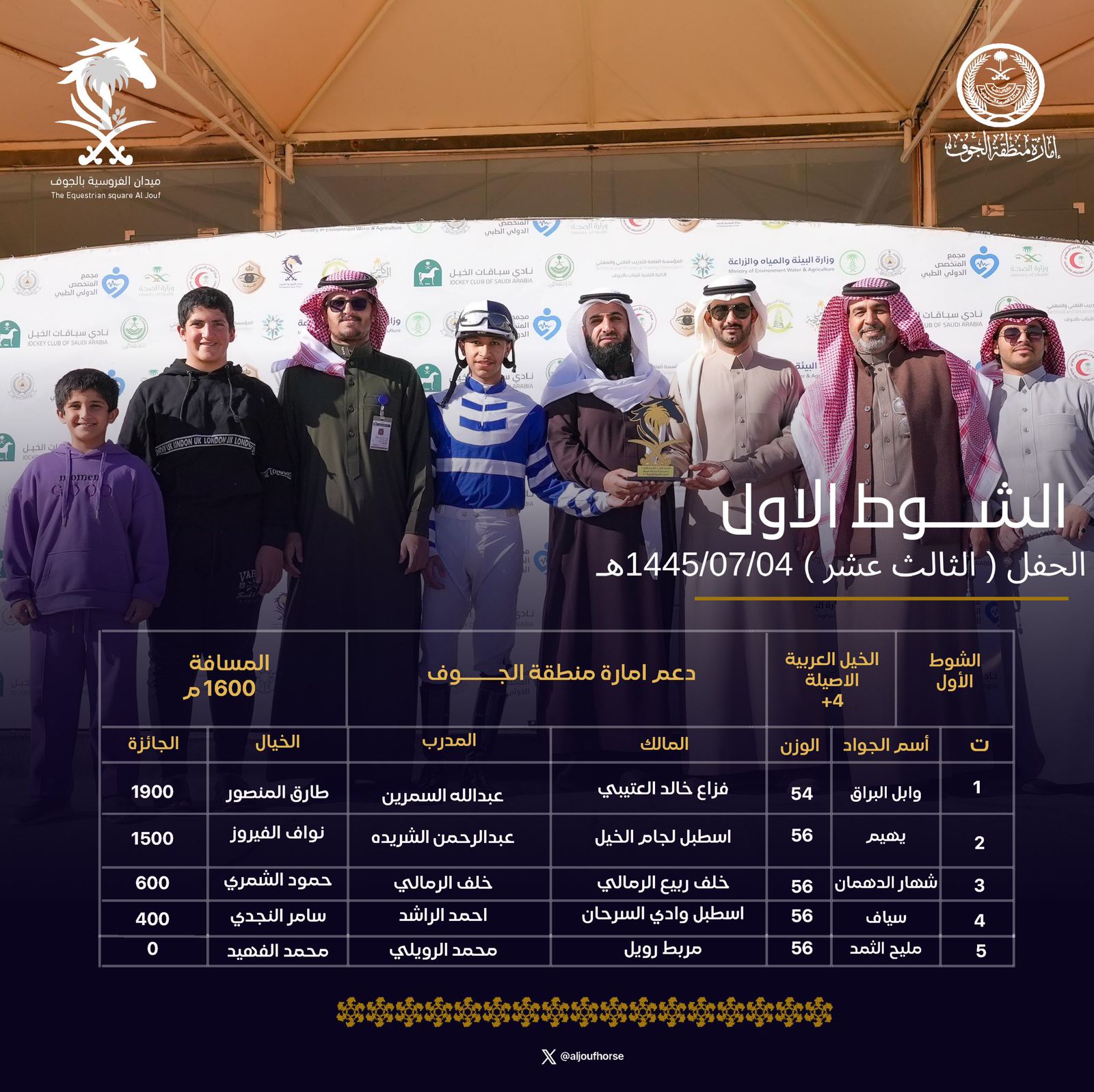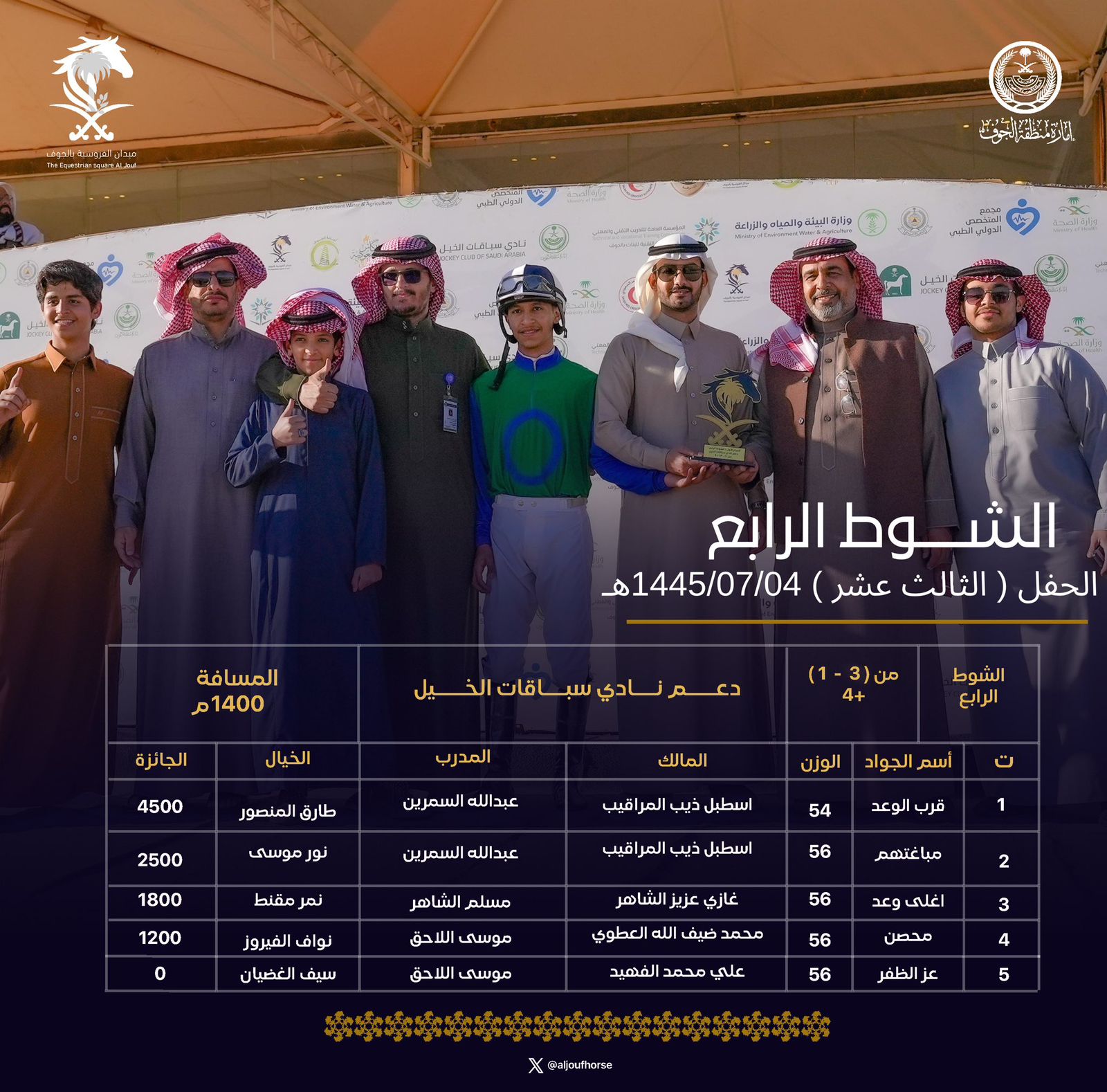 حصد 20 فائزًا جوائز المراكز المتقدمة في حفل السباقات الثالث عشر الذي أقيم اليوم بميدان الفروسية بالجوف ضمن منافسات موسم العام هذا العام 1445هـ، وشهد الحفل منافسة محتدمة بين الخيول والخيالة المشاركين للفوز بخمسة أشواط منها شوط بدعم من إمارة منطقة الجوف و4 أشواط بدعم من نادي سباقات الخيل.