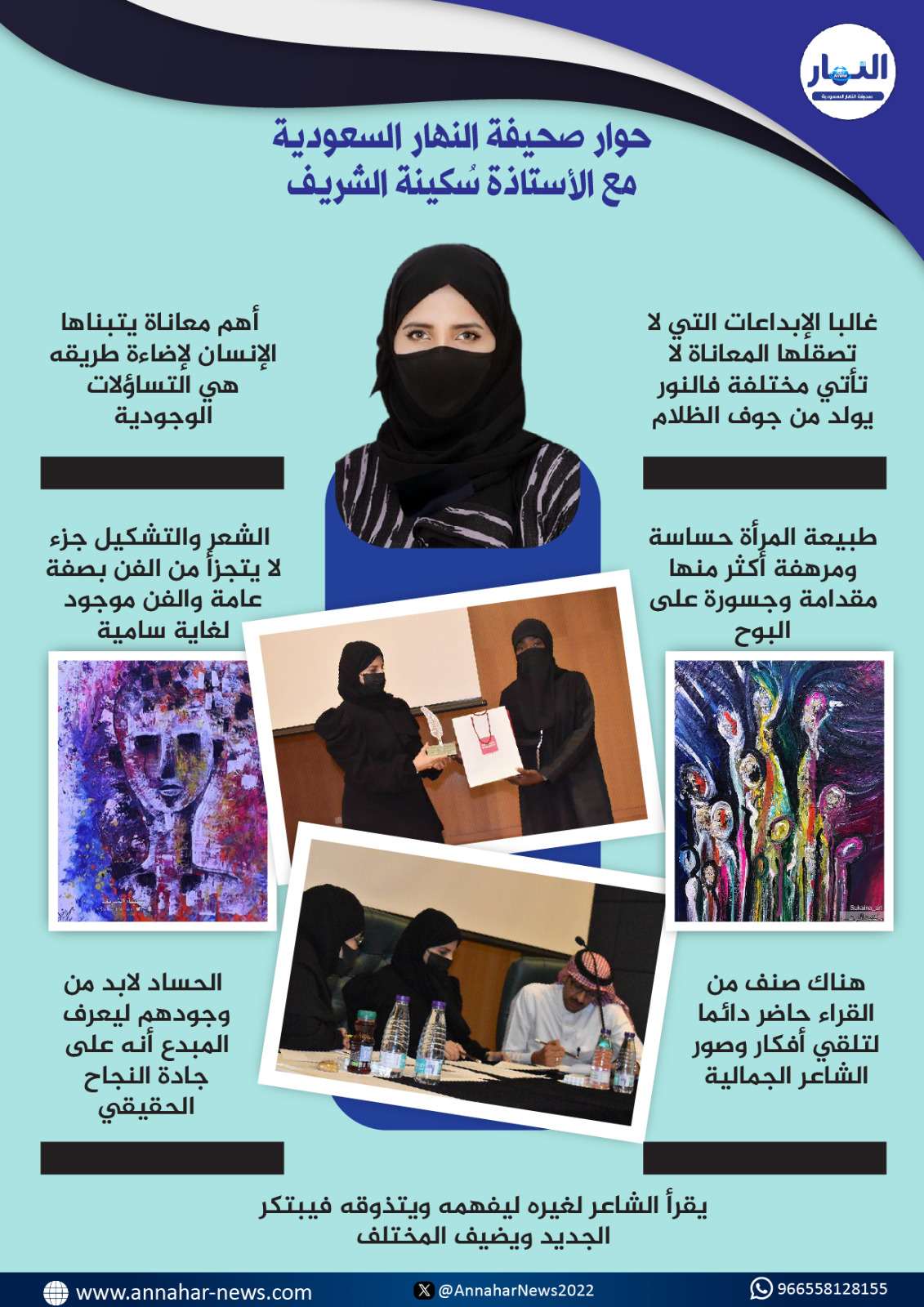 يسعدنا بصحيفة "النهار السعودية"، أن تكون الأستاذة سُكينة بنت سعد الشريف ضيفتنا، والتي أفسحت لنا حيزا من وقتها الثمين، أن تجيب على أسئلة، طالما تبحث عن أجوبة مختلفة عن موهبتها، ونخوض معها في كيف يولد الشعر مع الشاعر؟، وعن أفقها المعرفي الذي جعل منها تنظر للحياة بجمالها، وما فيها من معاناة من خلال شعرها وفرشاتها، التي تلون تفاصيلها بطريقة سريالية، وكيف أثرت في تكوين شخصيتها، وكيف ترى هذا التميز الذي ميزها عن غيرها، وهي ما زالت في مقتبل العمر وغيرها من الأسئلة فأهلا وسهلا بكم سيدتي الفاضلة: