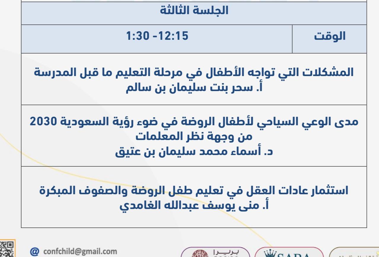 تقدم الخبيرة التربوية والمستشار التعليمي الأستاذة منى يوسف الغامدي، ورقة عمل، حول استثمار عادات العقل في تعليم طفل الروضة والصفوف المبكرة، في مؤتمر دراسات الطفولة المبكرة في العاصمة الرياض.