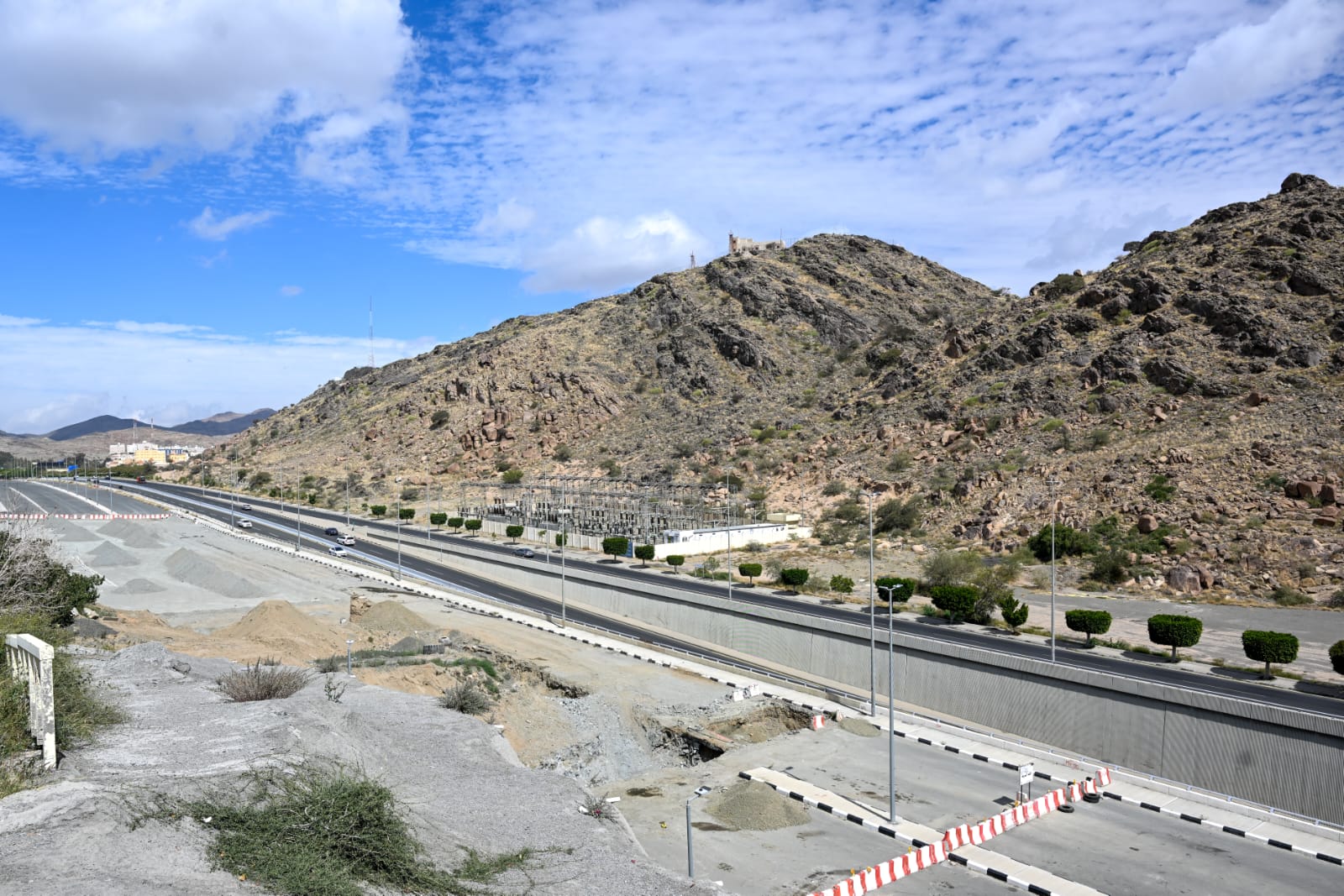 يذكر أن نسبة الإنجاز للمشروع بلغت ٨٥% ويبلغ عرض الطريق بعد التوسعة ٤٠متر مع مسارين للخدمة.