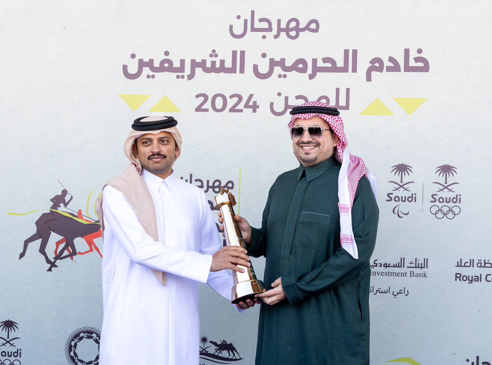 توج صاحب السمو الأمير فهد بن جلوي بن عبد العزيز بن مساعد رئيس مجلس إدارة الاتحاد السعودي للهجن اليوم الثلاثاء، ملاك الهجن من الإمارات وقطر الفائزين بألقاب أشواط رموز مهرجان خادم الحرمين الشريفين للهجن في فئة الـ "جذاع"، والذي انطلقت نسخته الأولى الخميس الماضي وينظمها الاتحاد السعودي للهجن حتى الـ 18 من شهر فبراير الجاري، على أرض ميدان الجنادرية في مدينة الرياض.