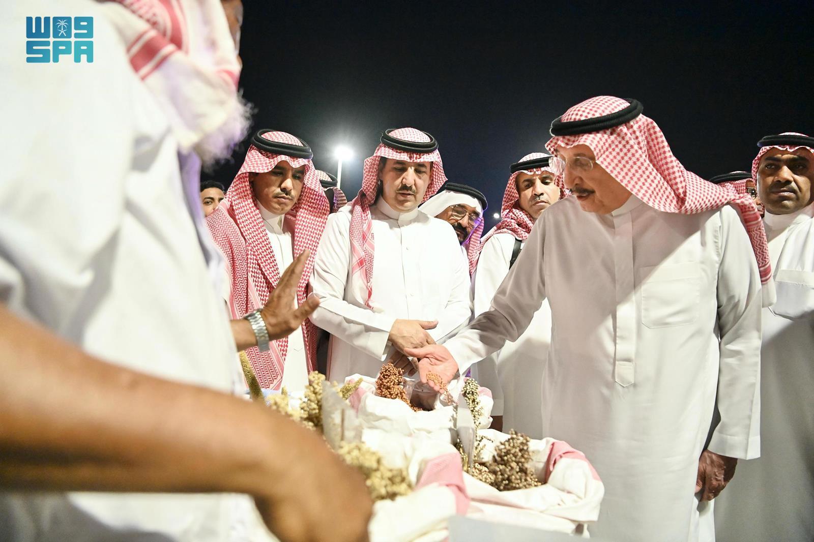 وتجول سموه في مختلف الأركان المتخصصة التي قدمت عرضًا للموروثات القديمة في محافظة صامطة، منها ركن الفن التشكيلي وركن الحناء وركن العضية والركن الثقافي وركن المنتجات الزراعية التقليدية من الذرة الرفيعة والدخن والسمسم، وحلويات زمان التي اشتهر الأهالي بصناعتها قديمًا مثل المشبك والحلقوم والجلجلان.