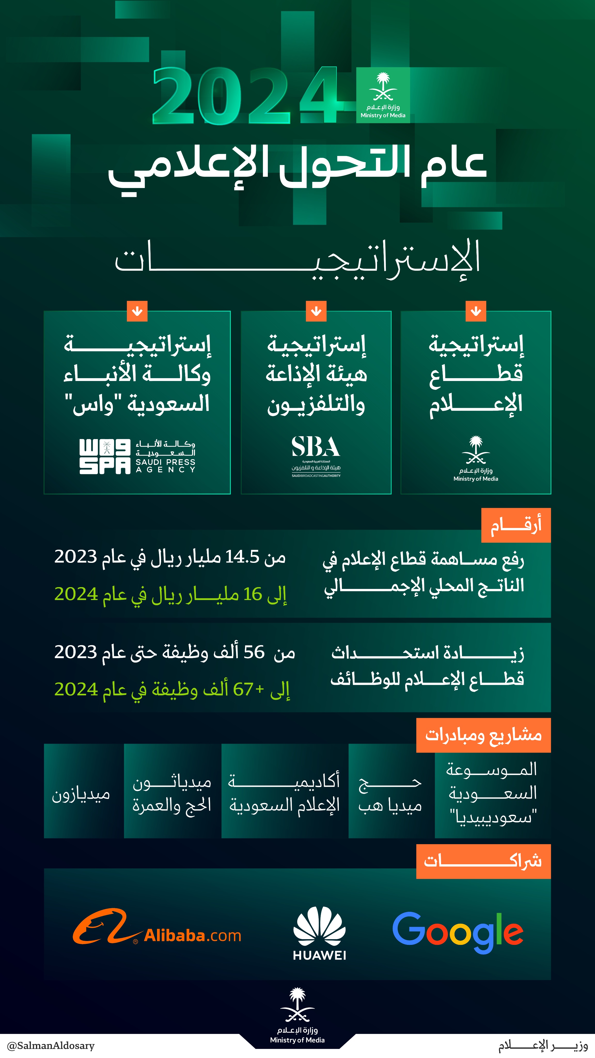 أكد وزير الإعلام الأستاذ سلمان الدوسري، أن ٢٠٢٤، هو عام التحول الإعلامي، مؤكدا في تغريدة له عبر حسابه الشخصي، على منصة "إكس" للتواصل الاجتماعي"":لن نثق سوى بالأرقام والمؤشرات، والشغف والعمل".