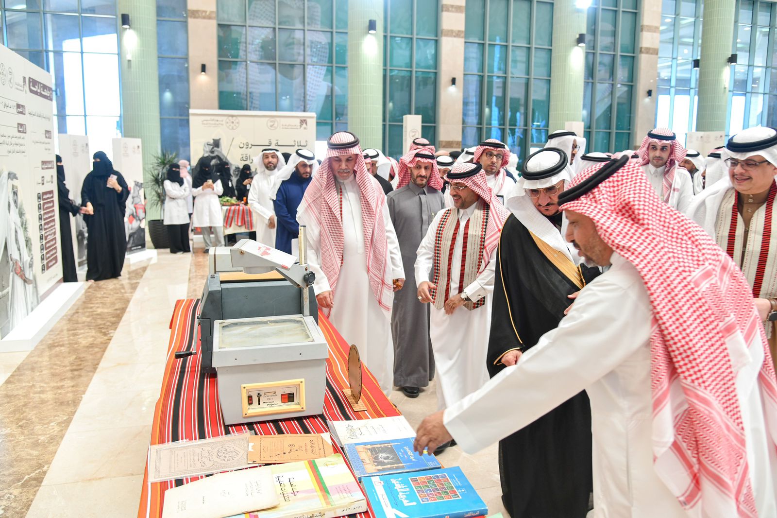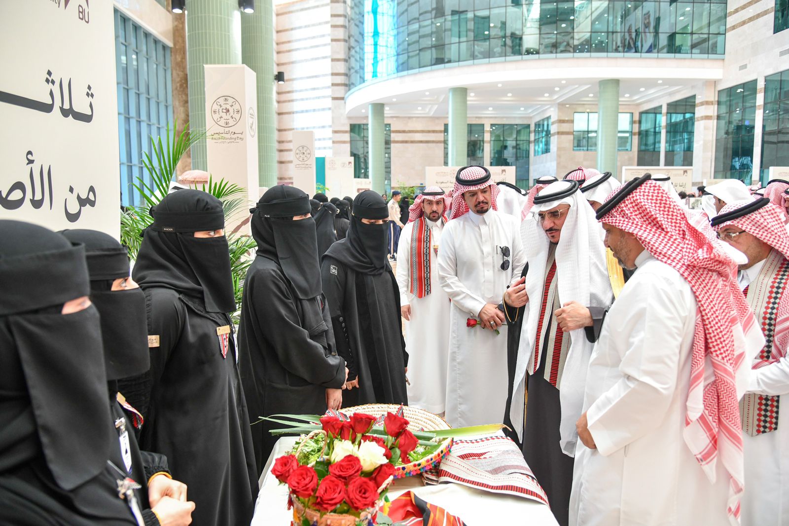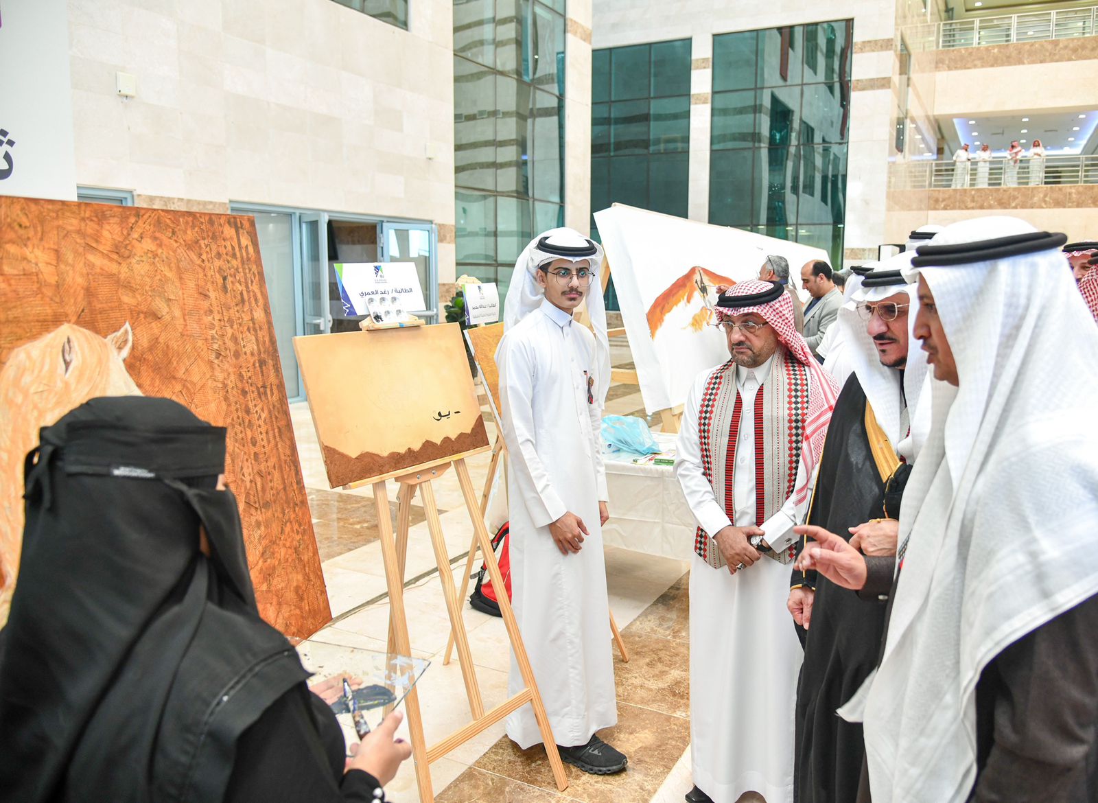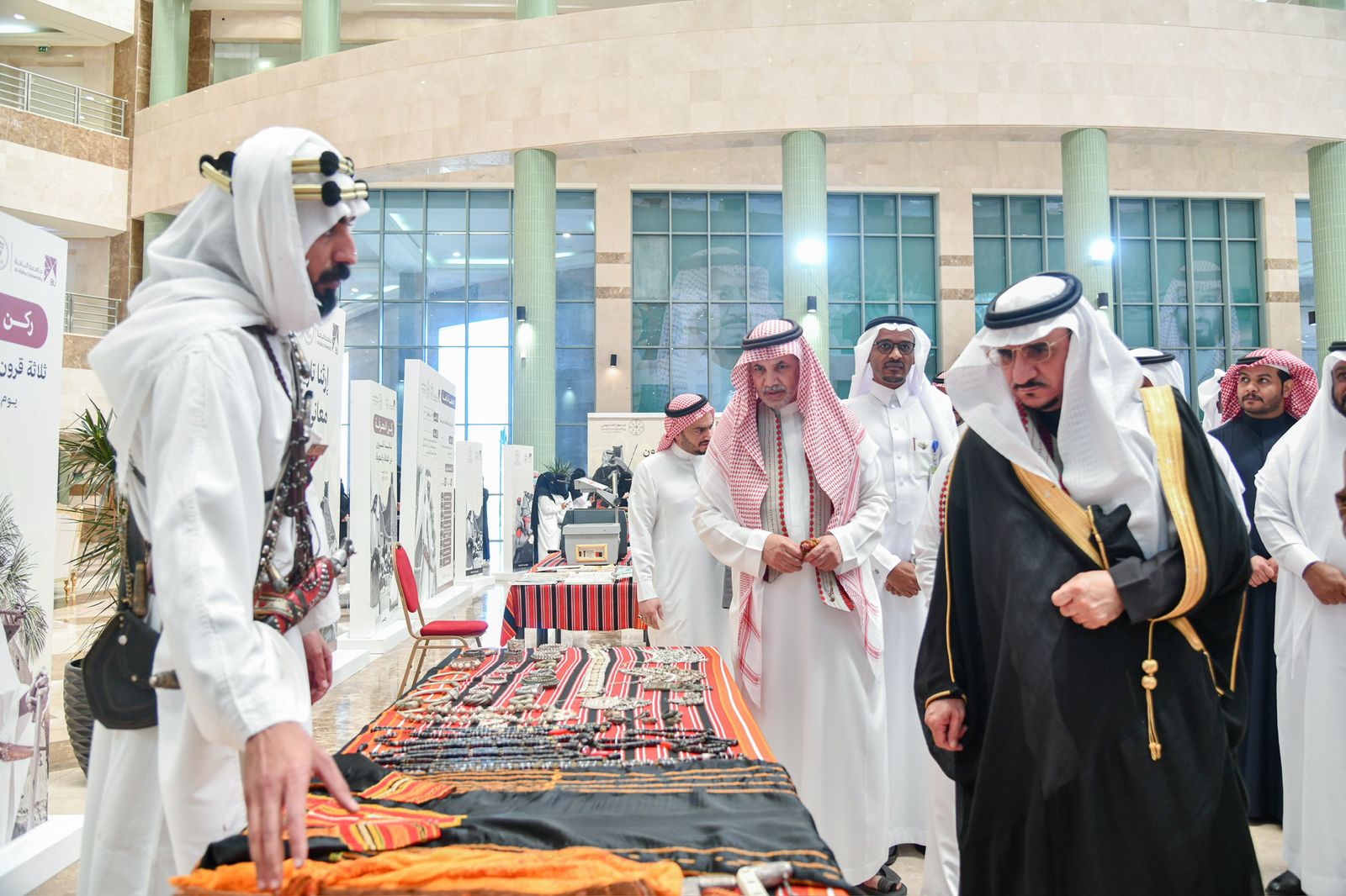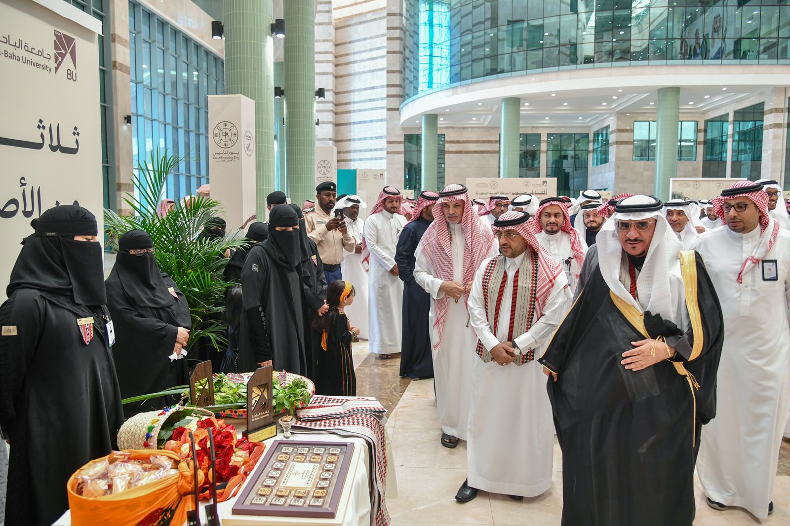 ودشن معالي رئيس جامعة الباحة المعرض المصاحب للاحتفال بيوم التأسيس اشتمل على عدد من الأركان التعريفية التي تحكي تاريخ الدولة السعودية وأمراءها وركن العلم الذي استعرض الراية الوطنية وملحقاتها كما اشتمل على ركاناً للخط العربي والفنون التشكيلية والأكلات الشعبية وجدارية مهرجان اللون التشكيلية ومتحفاً يضم عدد من القطع الأثرية بمشاركة متحف الأخوان ومتحف الأصالة.