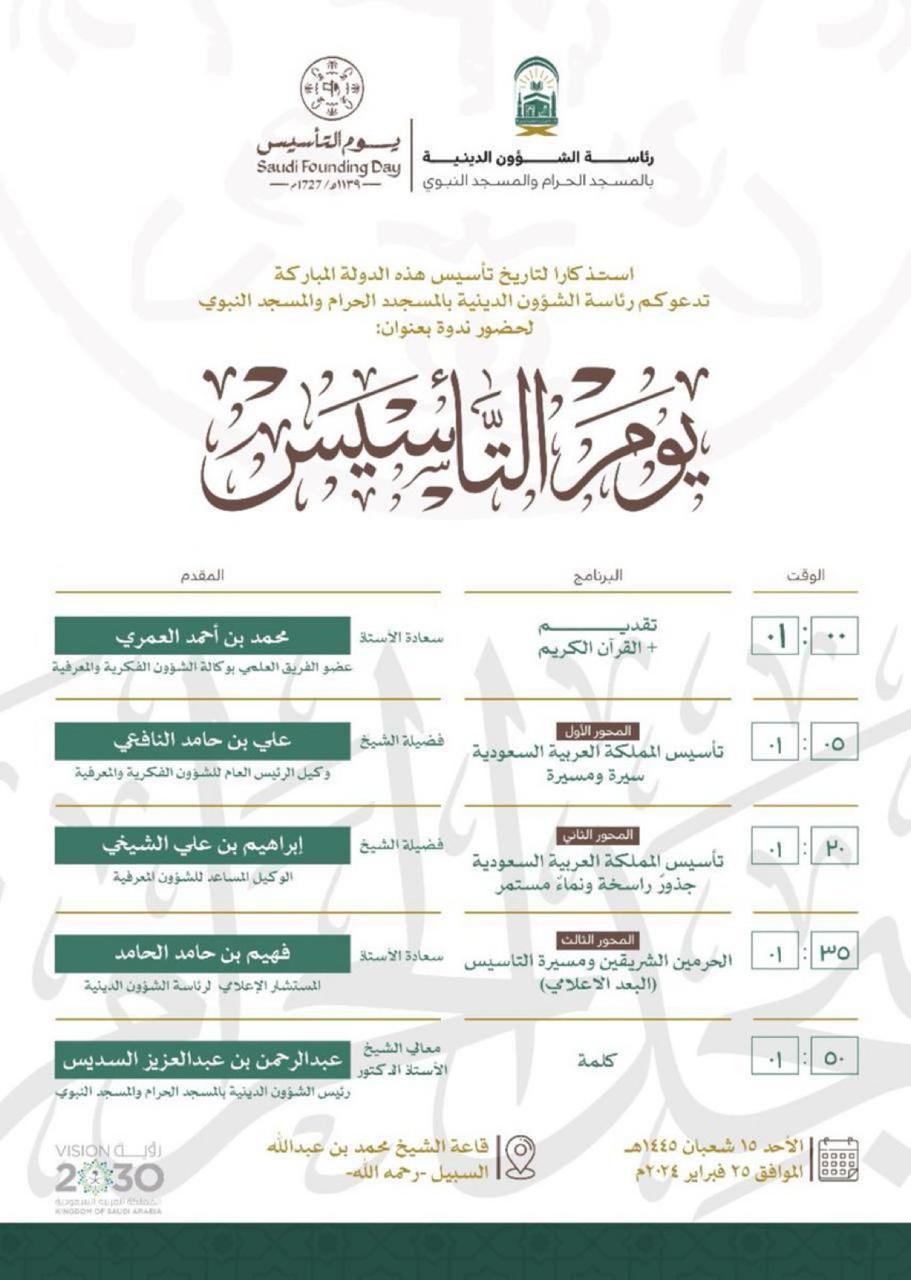 وأعدت رئاسة الشؤون الدينية سلسلة من اللقاءات الاثرائية لإبراز يوم تأسيس المملكة كونه بداية لتقدمها وازدهارها، حيث منّ الله عليها بالوحدة والتلاحم بين ولاة الأمر، حفظهم الله، وأبناء هذا الوطن الكريم والمعطاء، وترسيخ هذا اليوم في نفوس أبنائنا حب الوطن وشرف الانتماء له.