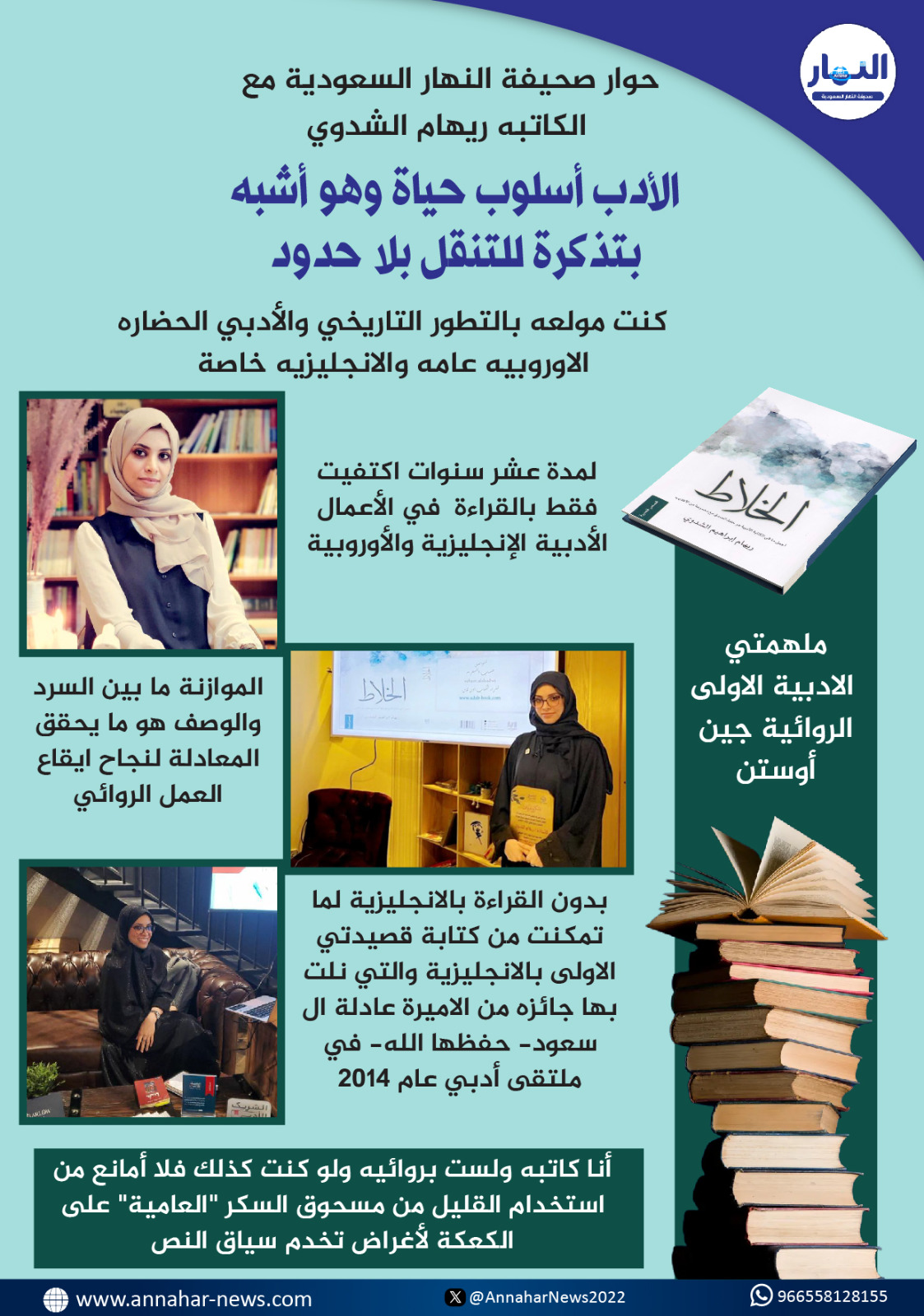 الادب أسلوب حياه، وهو أشبه بتذكره للتنقل بلا حدود و من خلال الاعمال الادبيه الى مناطق مذهله ومراكز خلابه من الجمال الكوني، بهذه الكلمات بدأت، الكاتبه ريهام الشدوي، حوارها مع صحيفة النهار السعودية.
