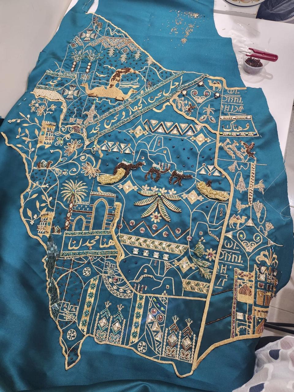 وتضيف: "بعدها تم تقسيم المناطق، ولأن أعضاء نادي رواد الازياء متواجدين حول المملكة اتفقنا على تنفيذ كل منطقة على يد حرفيين المنطقة نفسها، وقبل توزيع رقعات التصميم تم تطريزها أليا بمساعدة ودعم الدكتور عمرو سالم، ومساعده يحيى والتي بلغت مليون و400 الف غرزة، كذلك تطريز كم الزي الرجالي، الاكمام والياقة للفستان بمساعدة المصممة سهيلة حافظ. والتي تقدر ب ١٠٠ الف غرزة .