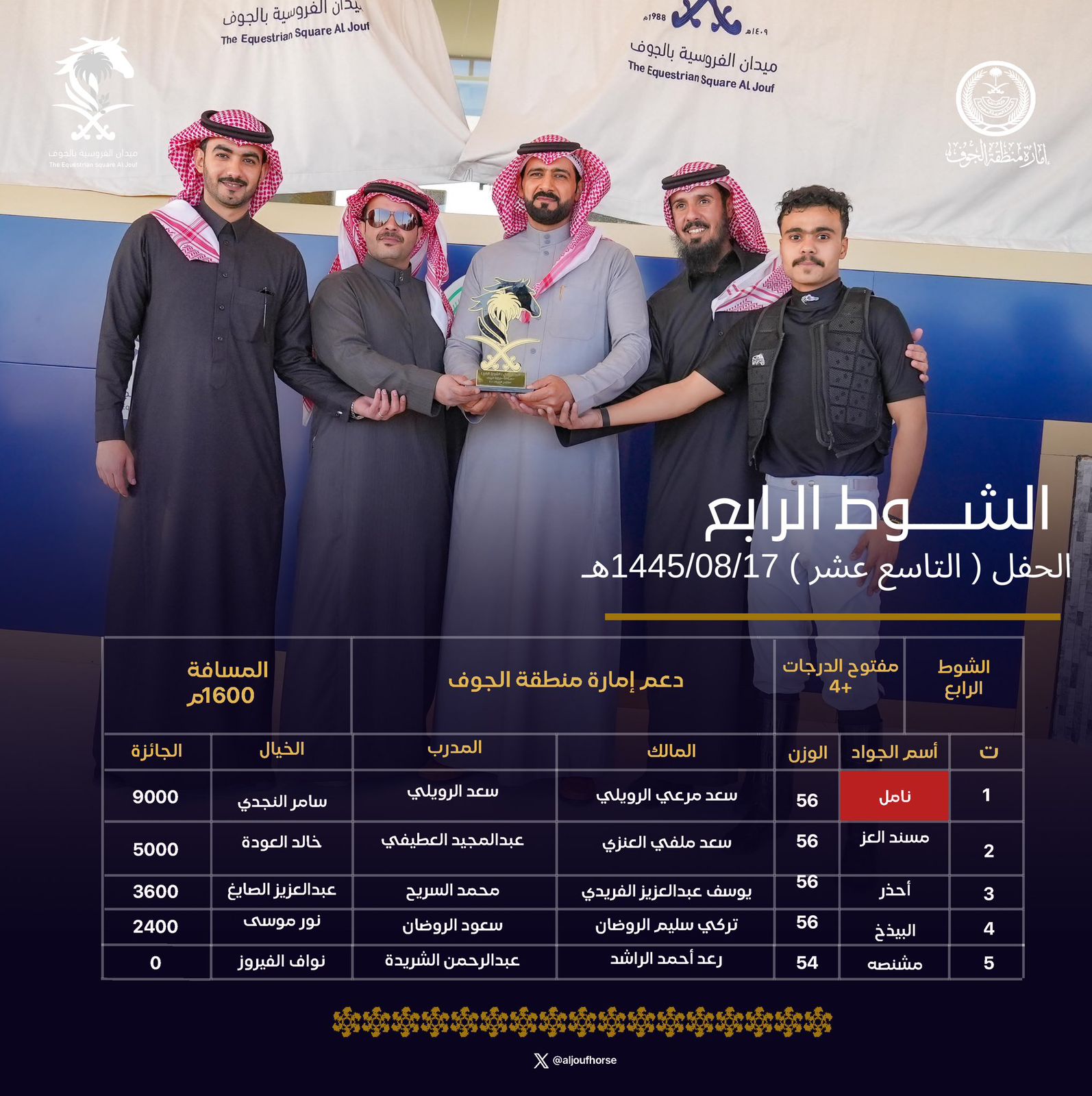 وفاز بالشوط الرابع الجواد "نامل" والمالك والمدرب سعد الرويلي والخيال سامر النجدي، وفاز بالشوط الخامس الجواد "حليفي" والمالك مسفر الرويلي والمدرب عبدالله الزايد والخيال خالد الرويشد.