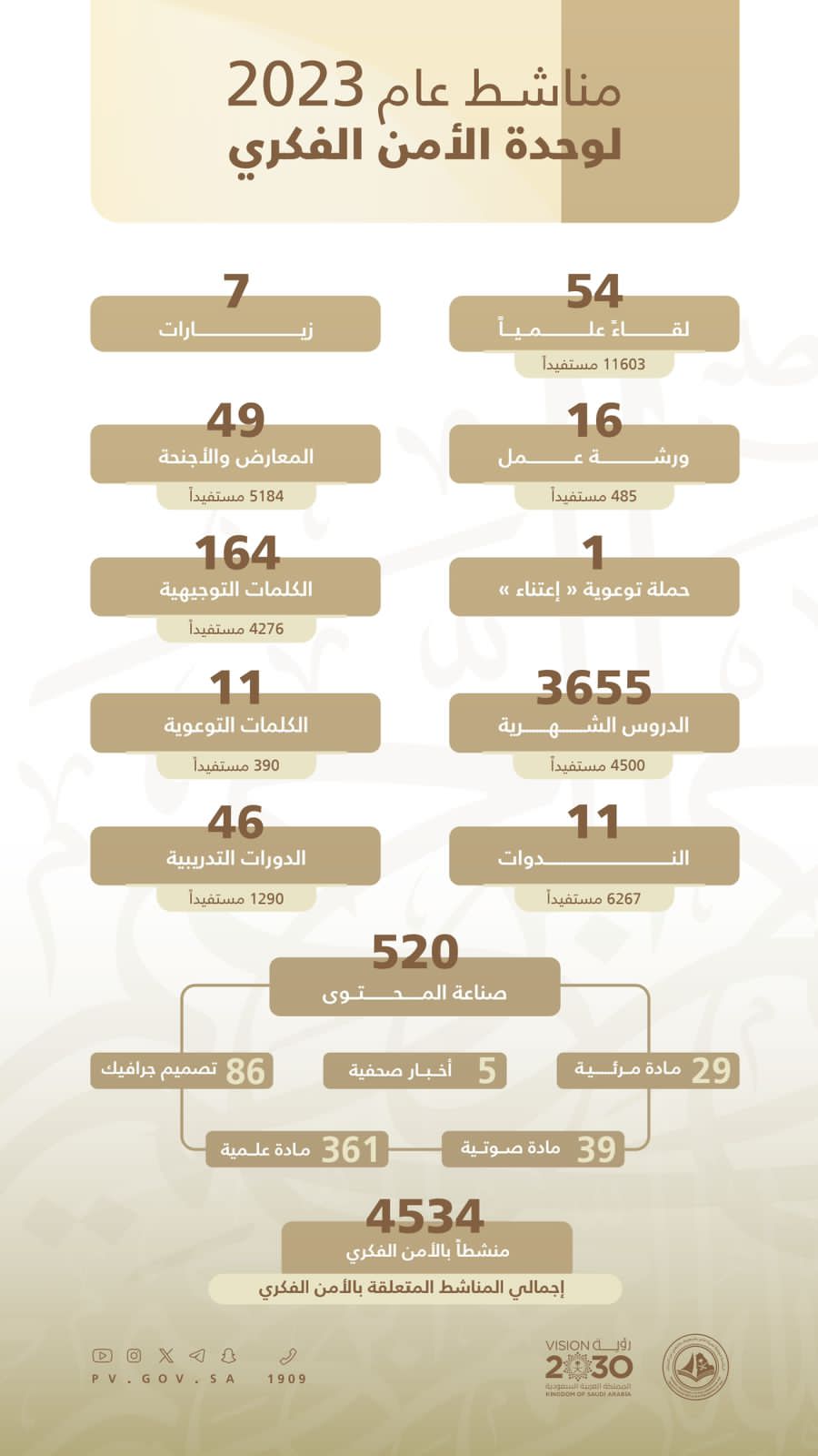 كشفت الرئاسة العامة لهيئة الأمر بالمعروف والنهي عن المنكر عبر تقرير رقمي عن أبرز المناشط التي نفذتها وحدة الأمن الفكري بالرئاسة العامة وفروعها خلال العام المنصرم 2023م.