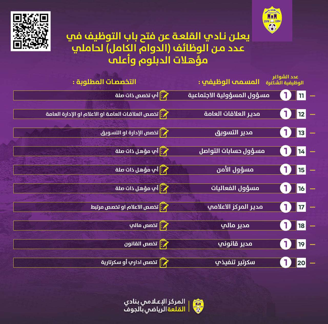 أعلن نادي القلعة الرياضي بمنطقة الجوف عن فتح باب التوظيف لشغل عدة وظائف "الدوام الكامل" في عدد من التخصصات لحاملي مؤهلات الدبلوم وأعلى.