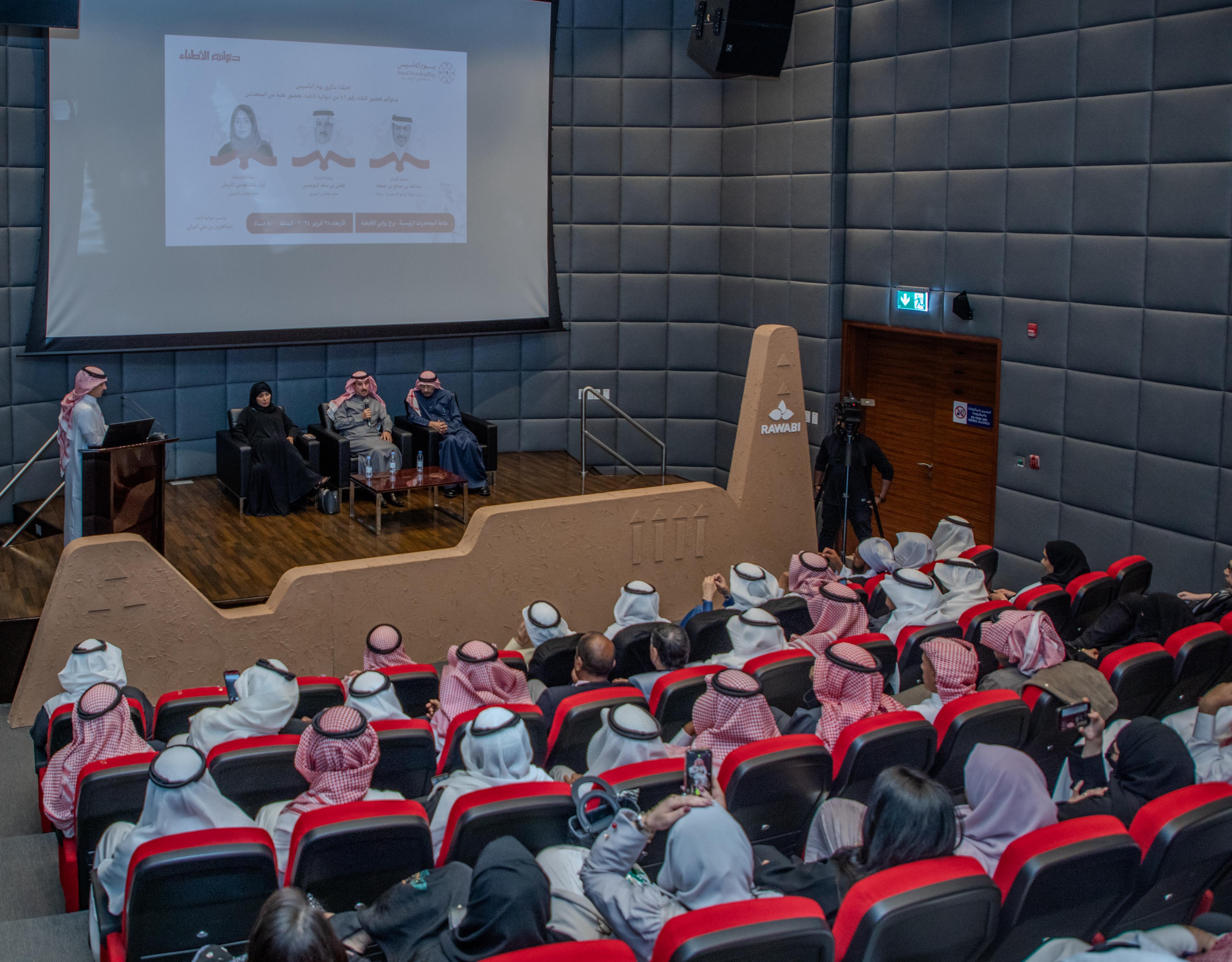 وأكدوا خلال لقاء ديوانية الأطباء في لقائها رقم 86 الذي حمل عنوان (الاحتفاء بيوم التأسيس) مساء امس الاول بالخبر، على أن الاحتفاء بيوم التأسيس يمثل قوة دافعة للحفاظ على مكتسبات هذه الأرض بعمقها الحضاري وفلسفتها السياسية وموقظا للذاكرة الوطنية بمفاهيمها المختلفة تجاه النظرة إلى الذات والأرض، مشيرين إلى أهمية استذكار تضحيات رجال الدولة السعودية في مراحلها الثلاث لبناء دولة عصرية منافسة، ومشددين على أهمية الحفاظ على المكتسبات واستكمال البناء والنماء لتكون المملكة دوما في مصاف الدول العريقة والمتقدمة، مشيرين إلى الجهود الكبرى التي بذلها الإمام محمد بن سعود -رحمه الله- الذي تولى إمارة الدرعية عام 1139هـ/ 1727م، في تأسيس الدولة السعودية الأولى والذي أخذ على عاتقه العمل على تحويل الدرعية البلدة النجدية إلى مركز استقرار لجميع البلدات النجدية، وتحرير منطقة نجد من الفوضى السياسية والجهل.