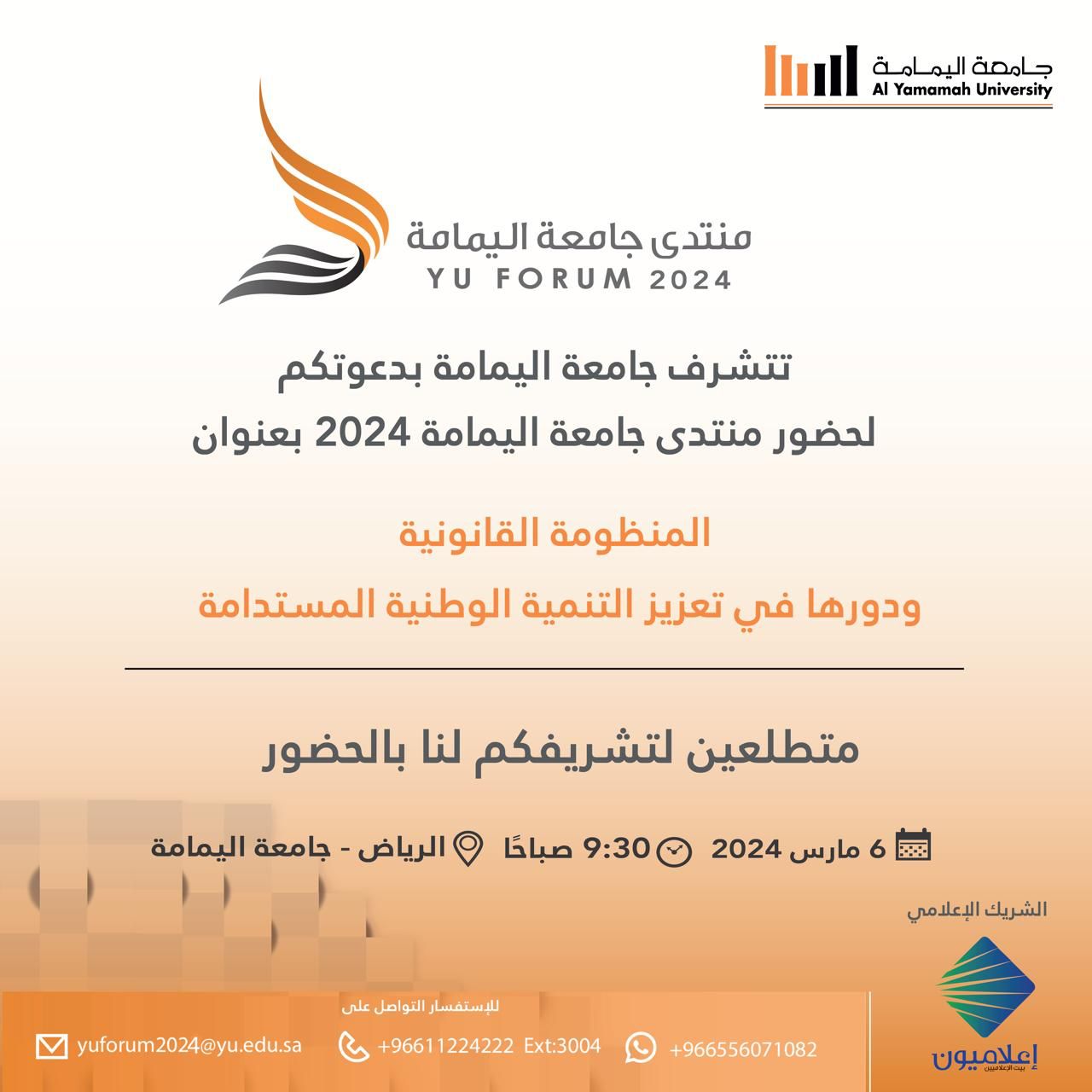 بحضور معالي الأستاذ الدكتور محمد بن أحمد السديري نائب وزير التعليم للجامعات والبحث والابتكار، تنظم جامعة اليمامة "منتدى جامعة اليمامة 2024" تحت عنوان "المنظومة القانونية ودورها في تعزيز التنمية الوطنية المستدامة"، وذلك صباح غدٍ الأربعاء 25 شعبان 1445 هـ الموافق 06 مارس 2024 م في مقر جامعة اليمامة بالرياض.