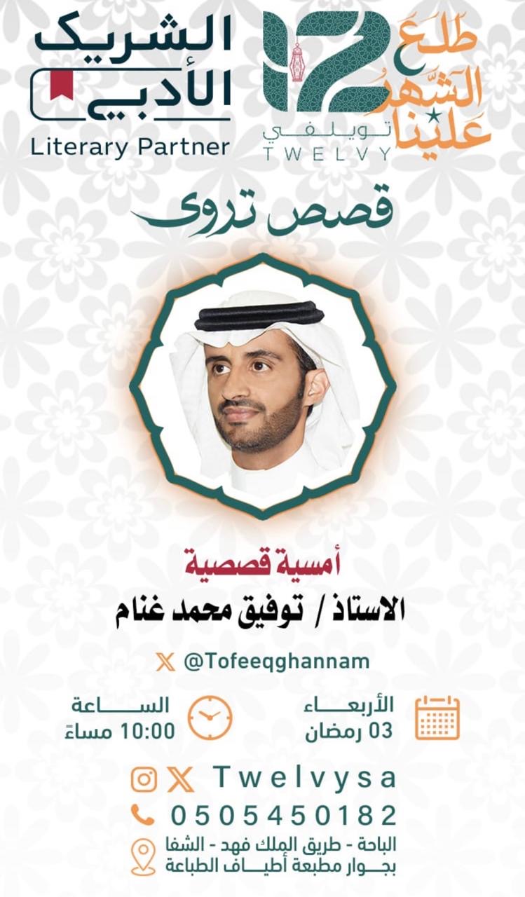 يستضيف مقهى تويلفي الثقافي بالتعاون مع الشريك الأدبي أمسيات ثقافية تحت عنوان "قصص تروى"، والتي تُقام في أول ثلاث أيام من شهر رمضان الكريم.