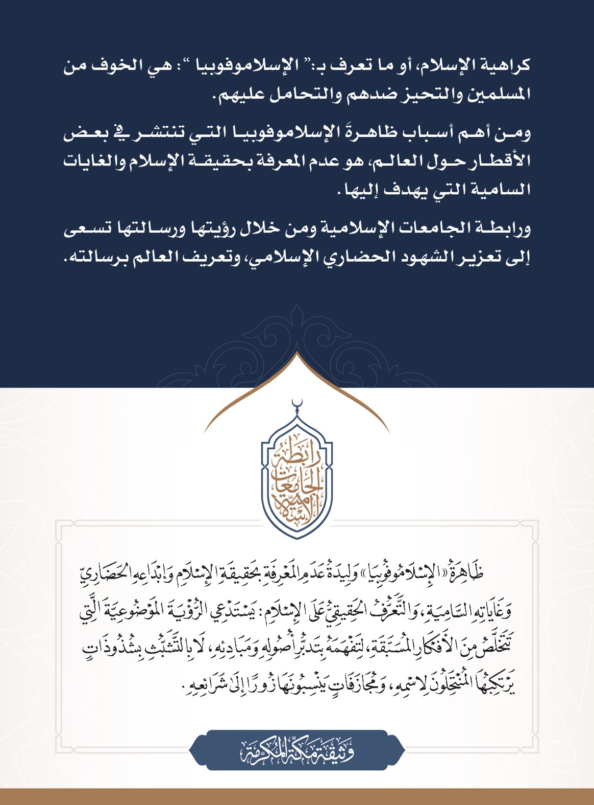 من جانبها أكدت رابطة الجامعات الإسلامية أن عدم المعرفة بحقيقة الإسلام وغاياته السامية وإنسانيته السمحة، من أهم أسباب انتشار ظاهرة الإسلاموفوبيا.