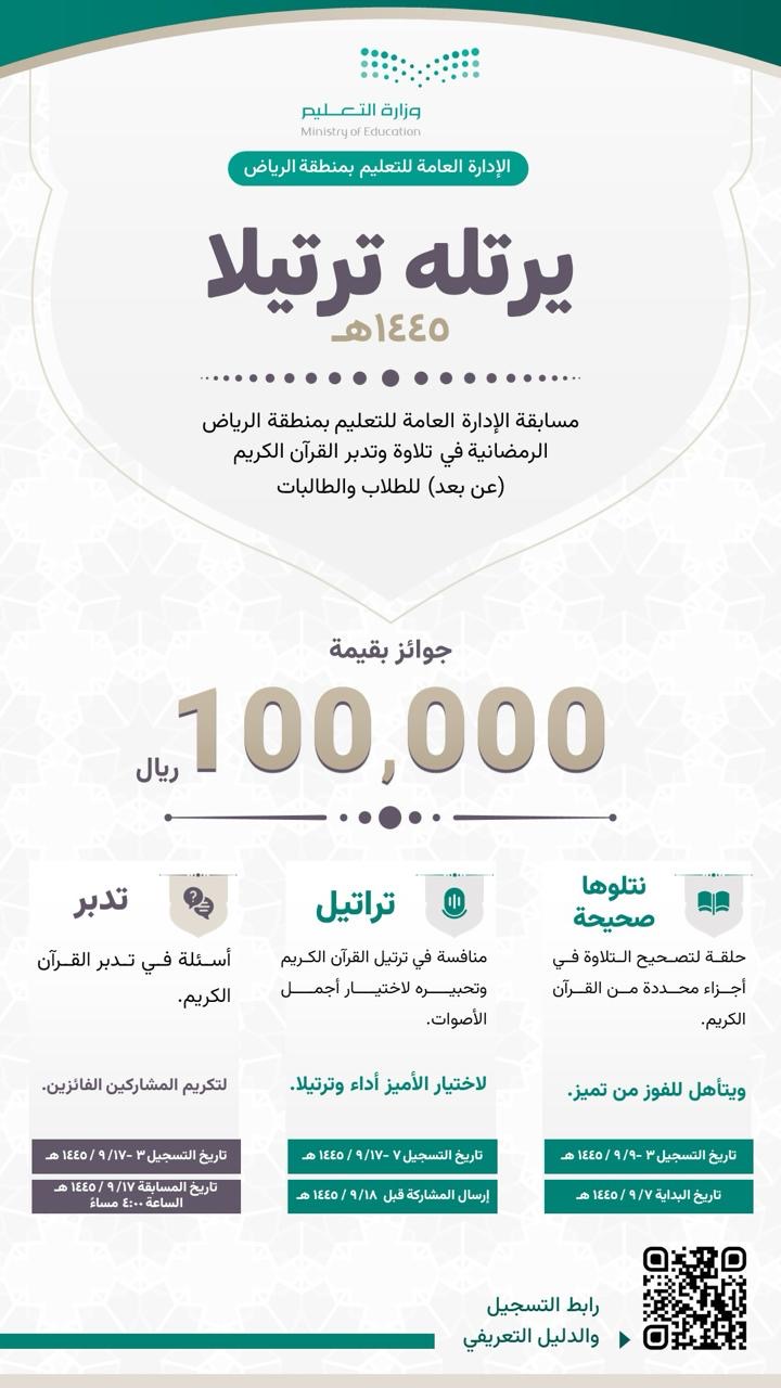 أطلقت الإدارة العامة للتعليم بمنطقة الرياض، المسابقة الرمضانية عن بُعد لتلاوة القرآن الكريم وتدبّره " يُرَتّلهُ تَرْتِيْلاً "، للطلاب والطالبات في مختلف المراحل التعليمية، بجوائز تصل قيمتها إلى 100 ألف ريال.