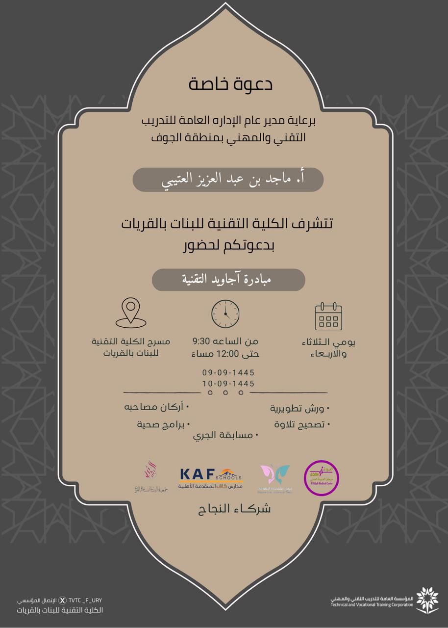 برعاية مدير عام التدريب التقني والمهني بمنطقة الجوف الأستاذ ماجد بن عبدالعزيز العتيبي نظمت الكلية التقنية للبنات بالقريات مبادرة بعنوان "آجاويد التقنية" بمشاركة العديد من الفعاليات الثقافيه والدينية والترفيهيه في شهر الخير والبركة رمضـان المبارك.