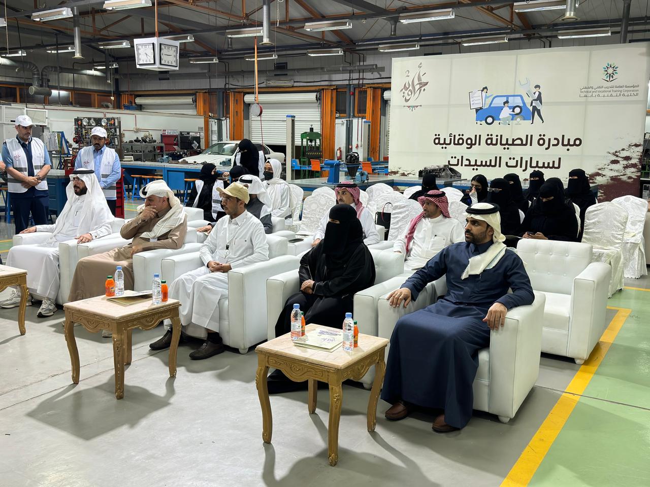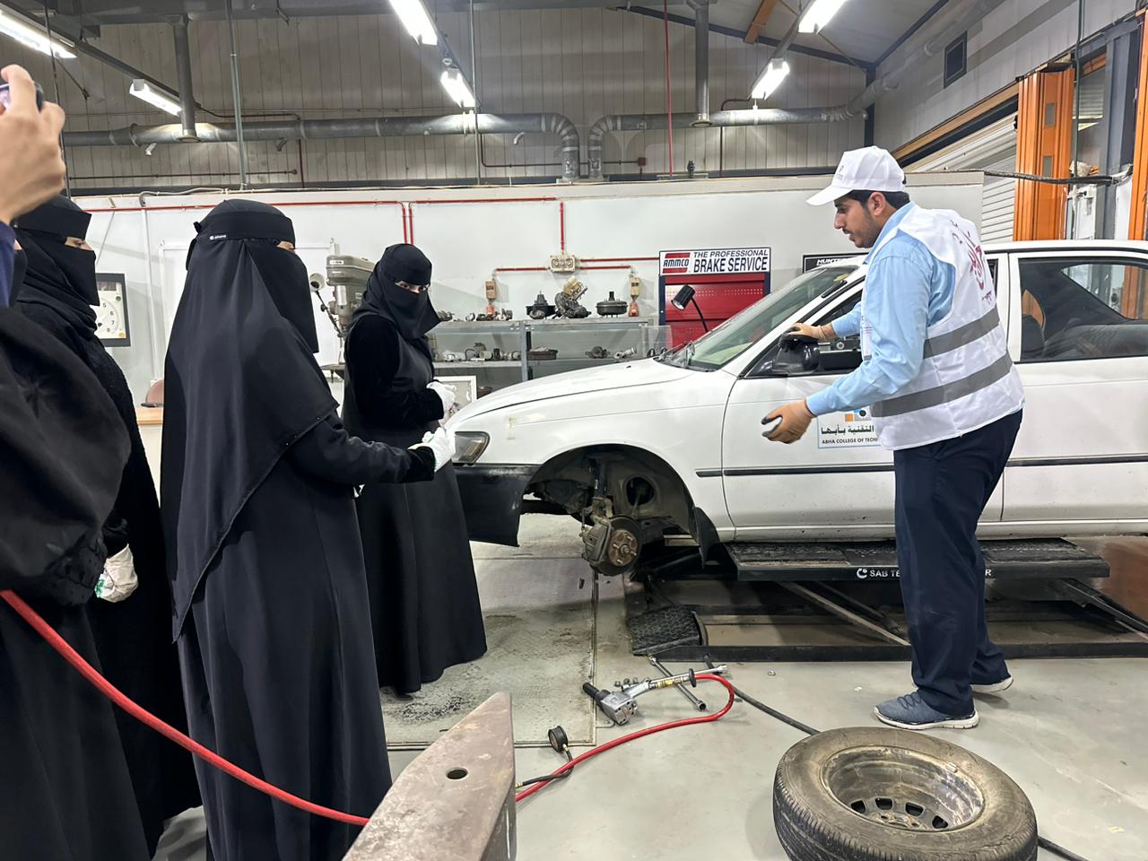 وتجول الجميع في ورشة السيارات واستمعوا الى شرحا من مهندسي القسم عن ما يقدم للسيدات من تدريب عملي في مجال كهرباء السيارات والاعطال والفرامل والمحرك الميكانيكي وصيانة البطاريات وشهدت المبادرة تفاعلا من الجميع