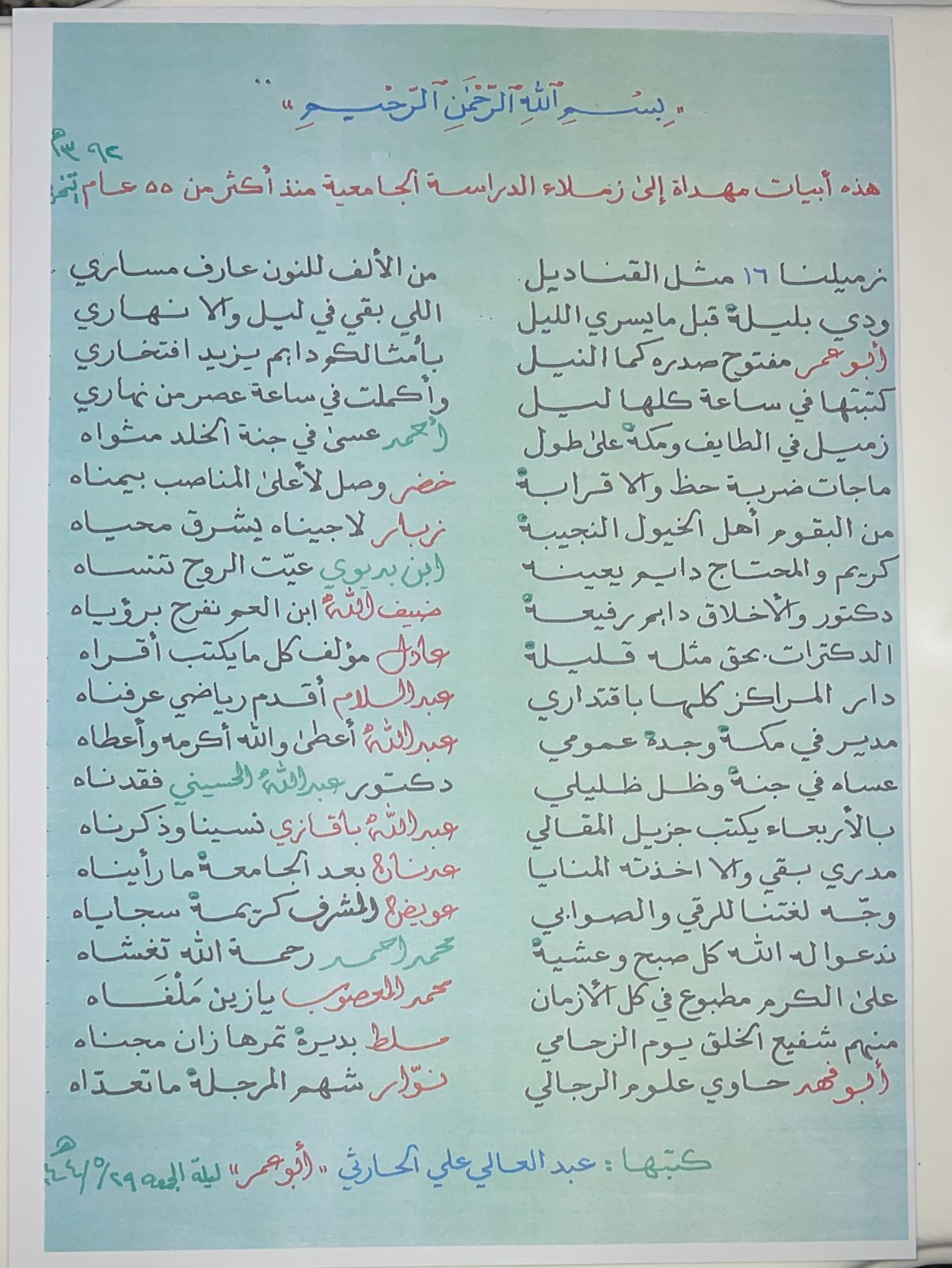 كان حوارنا الماضي بصحيفة النهار السعودية مع الأستاذ عبدالعالي الحارثي القيادي التربوي والأديب والذي تطرق فيه للصداقة الوثيقة التي ربطته مع زملائه في الجامعة حين كان طالبا في كلية اللغة العربية ونظم أبيات من الشعر فيهم وعددهم ستة عشر شخص فأبدع في تصوير وشائج هذه الصداقة والتي دامت لأكثر من خمسة وخمسين عام وهم متواصلين متحابين متآخين فمنهم من توفاه الله وذكر سيرته العطره في القصيدة ومنهم حي يرزق أثنى عليه والأستاذ عبدالعالي من الأفياء الذين لم تغيرهم الحياة على مر السنين الطويلة ولكن الأوفياء يبقون اوفياء نبلاء يقول فيهم: