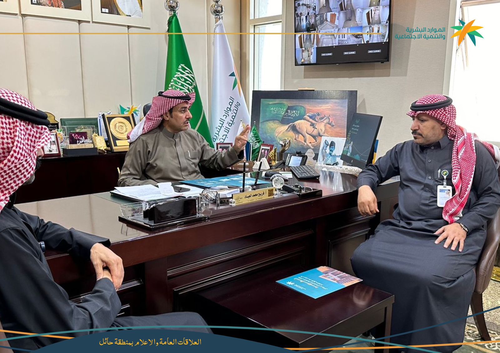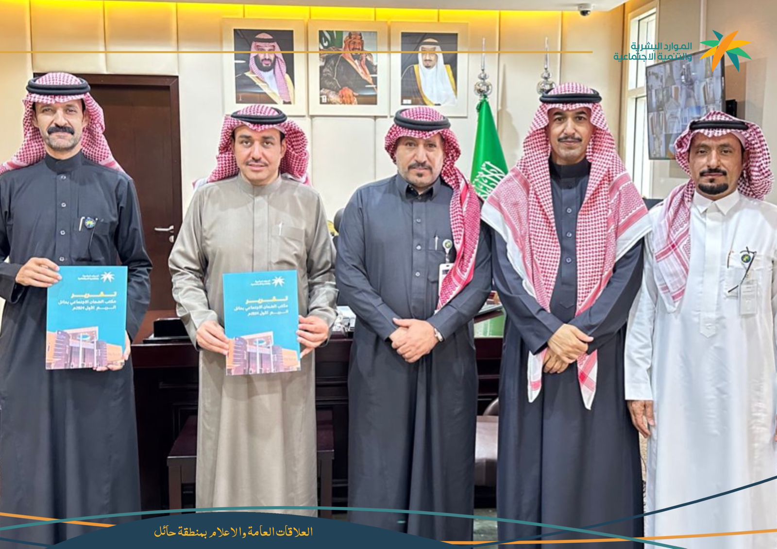 تسلّم مدير عام فرع وزارة الموارد البشرية والتنمية الاجتماعية بمنطقة حائل فريح بن محمد العيّاد ومساعديه للعمل والتنمية ياسر الدوش وأحمد الزامل تقرير الربع الأول للعام 2024 الخاص بمكتب الضمان الاجتماعي من مدير المكتب عبدالله السوهج وبحضور مساعد مدير إدارة التمكين بالفرع عبدالله خلف الشمري.