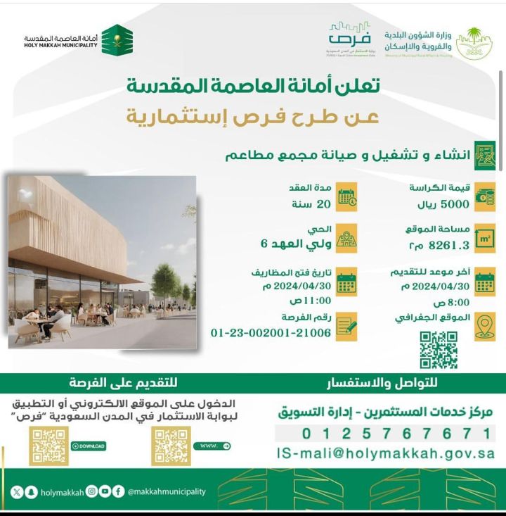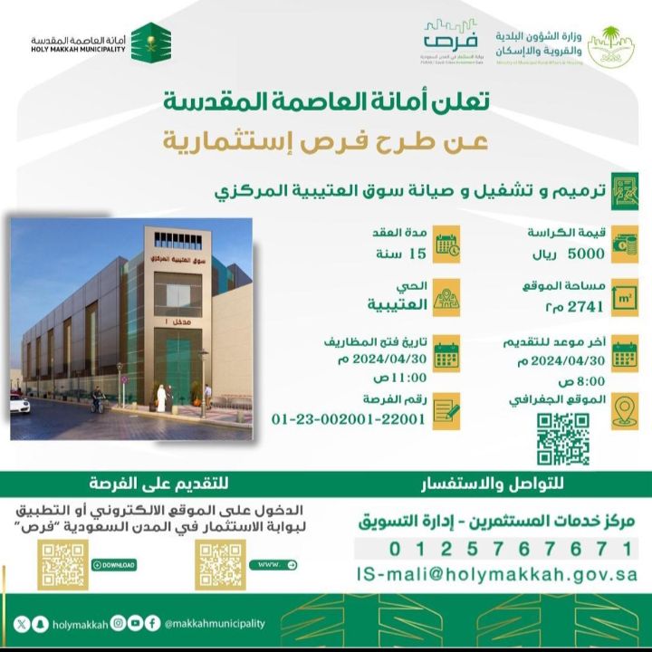 طرحت أمانة العاصمة المقدسة عدد من الفرص الاستثمارية في مواقع متفرقة بمكة المكرمة وعبر نماذج متنوعة ، وذلك ضمن جهود الأمانة لإشراك القطاع الخاص في عملية التنمية التي تتطلب عروض فنية وخبرات تأهيلية لضمان جودتها ونوعيتها وقدرة المستثمرين على الإنجاز.