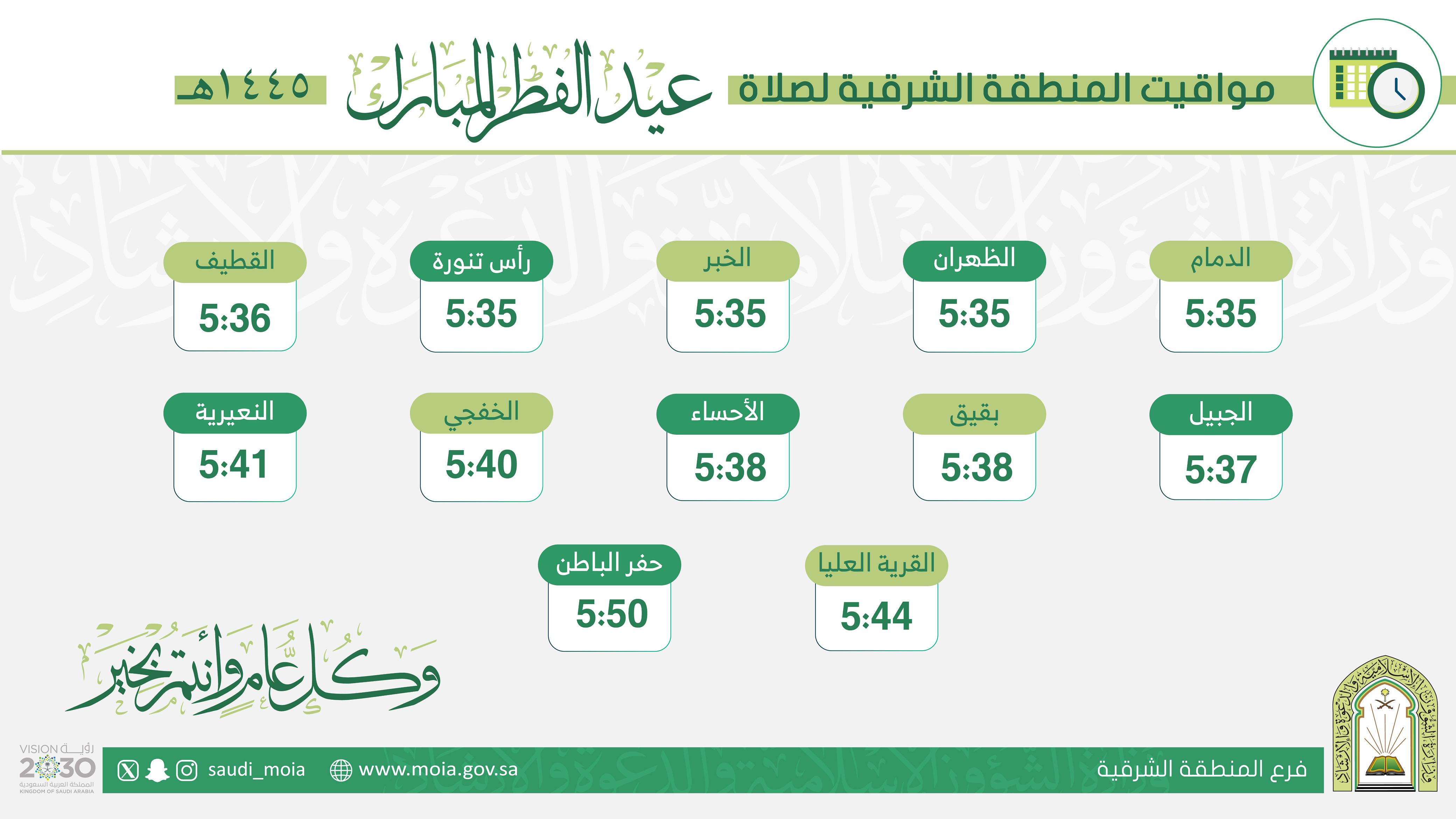 أعلن فرع وزارة الشؤون الإسلامية والدعوة والإرشاد بالمنطقة الشرقية أن صلاة عيد الفطر المبارك لهذا العام 1445 هـ، ستقام - بمشيئة الله - في 1051 جامعاً ومصلى تمت تهيئتها لاستقبال جموع المصلين، وحدد الفرع موعد إقامة الصلاة في جميع محافظات ومدن المنطقة الشرقية