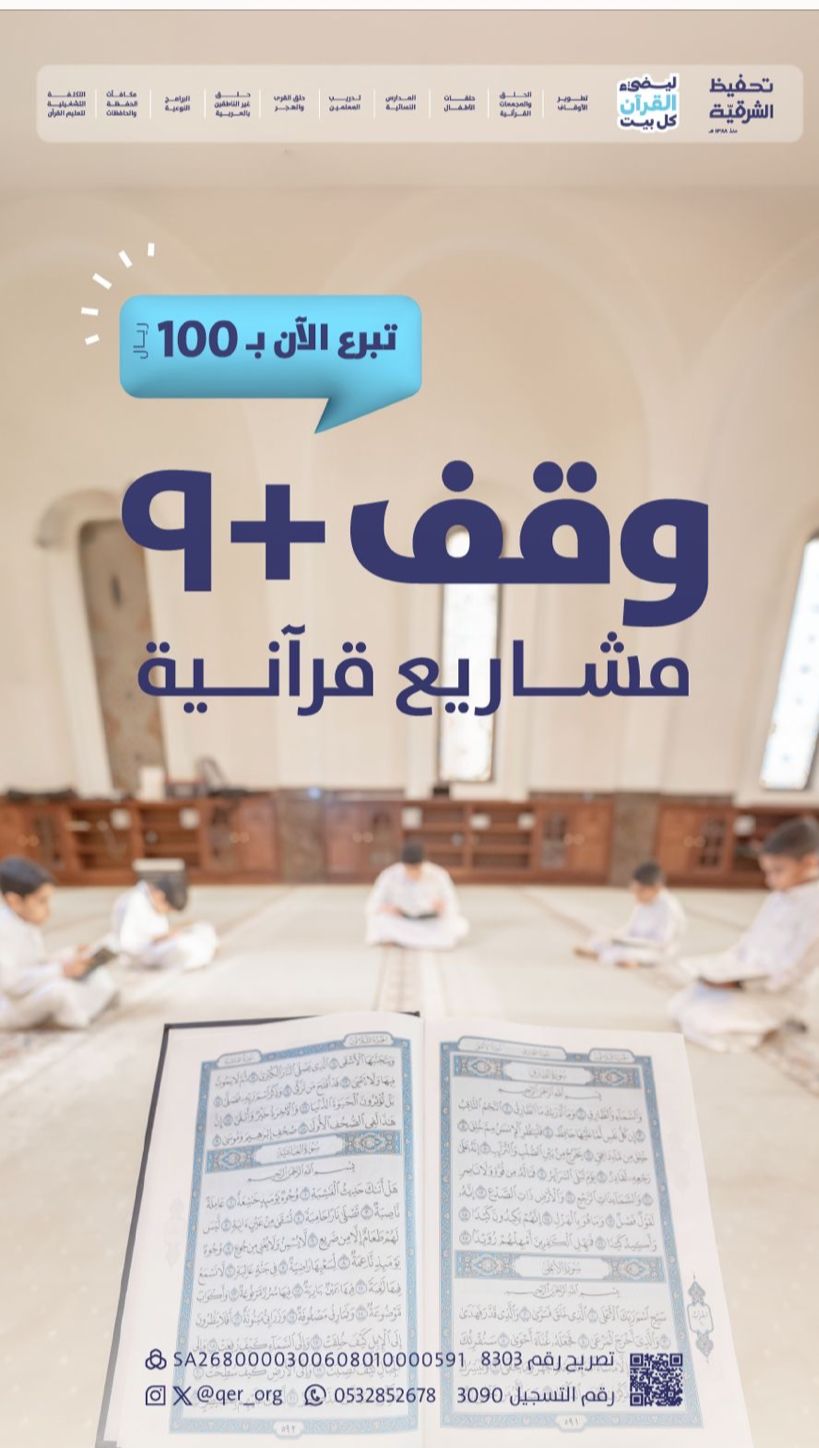 أطلقت جمعية تحفيظ الشرقية مرحلتها الأخيرة في العشر الأواخر من حملة " ليضيء القرآن كل بيت " بوقف وتسعة مشاريع قرآنية، ومازال الدعم مستمرًا في مشروع وقف وتسعة مشاريع قرآنية، وذلك بعد اكتمال أسهم ليلة 27 في مشروع تحفيظ الشرقية .