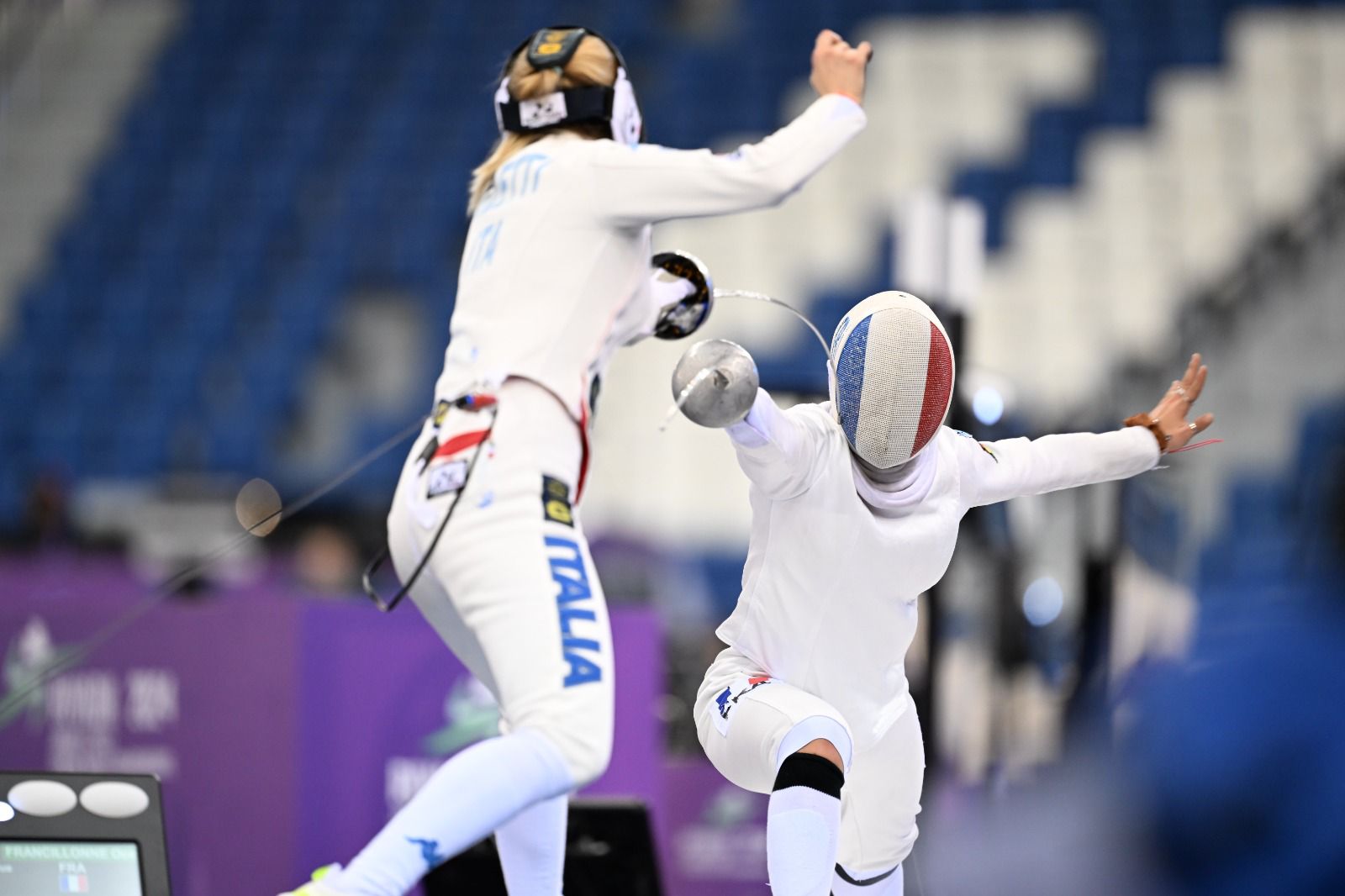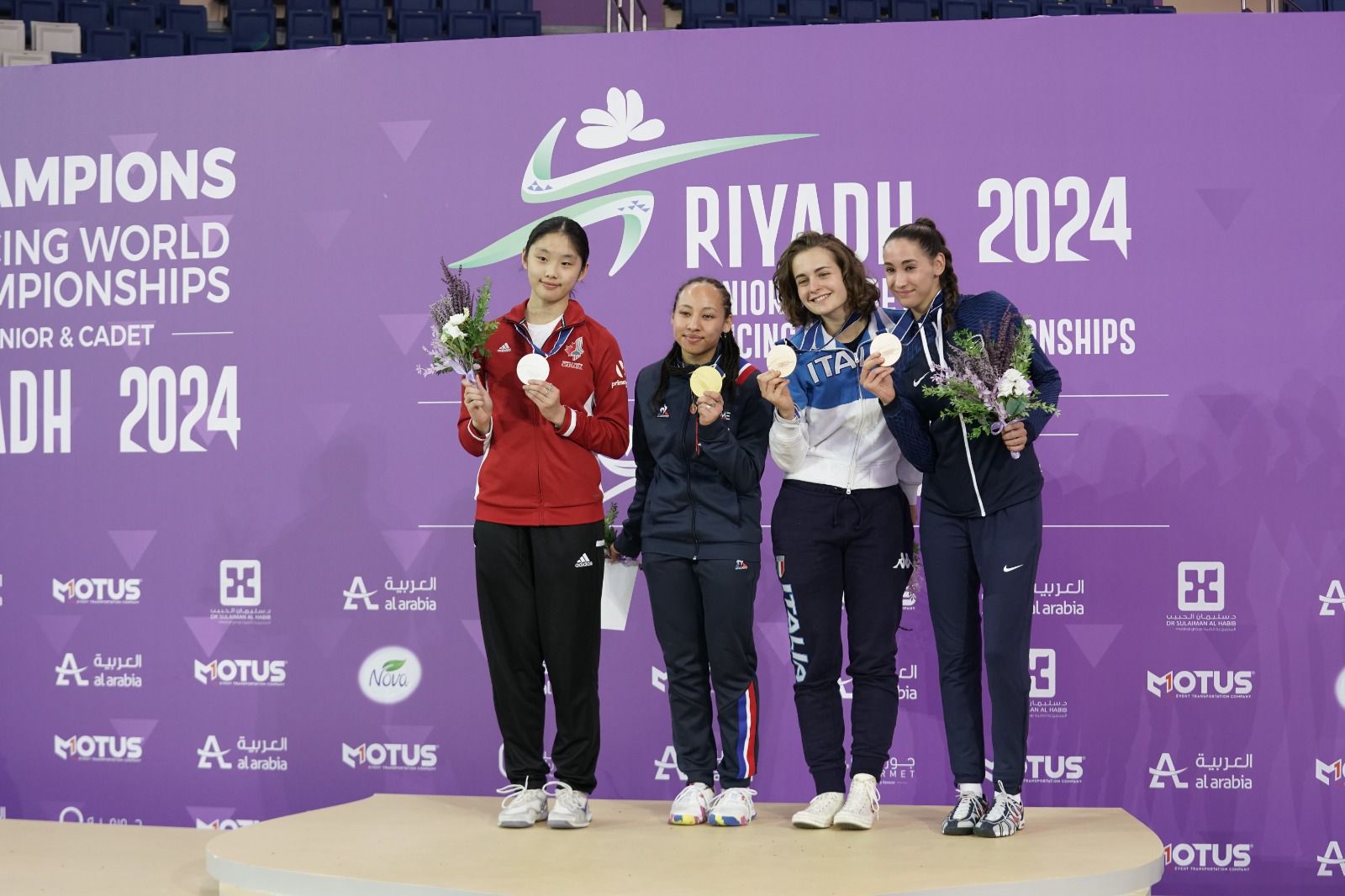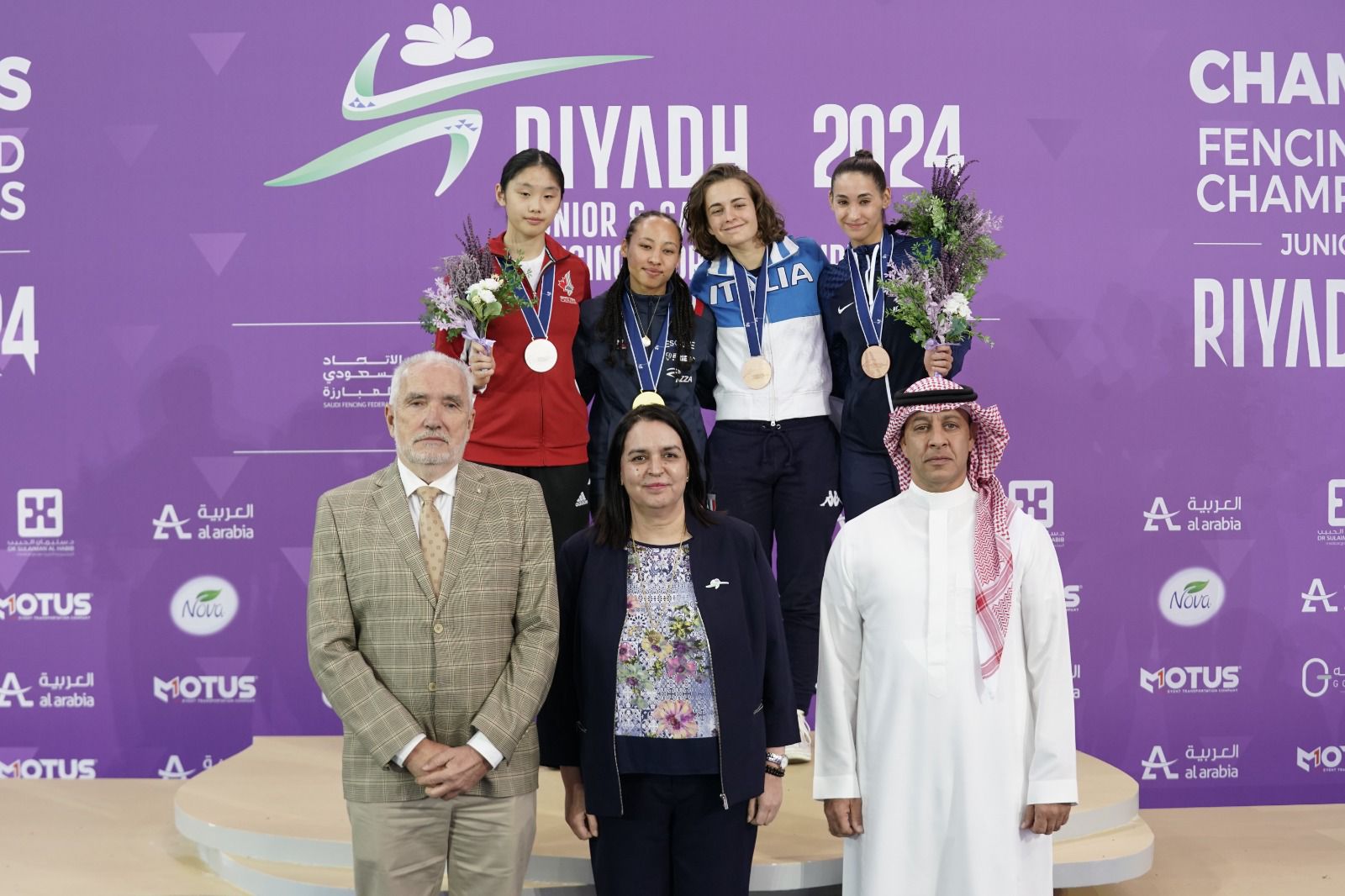 توج رئيس الاتحاد السعودي للمبارزة أحمد الصبان، الفائزات في اليوم الرابع من بطولة العالم للمبارزة للناشئين والشباب المقامة حاليا في صالة أرينا بجامعة الملك سعود في الرياض، بعد أن حصدت الفرنسية أوسيان فرانسيلوني الميدالية الذهبية، في منافسات سلاح الأبيه تحت 17 عام، عقب فوزها على الكندية جوليا يين التي نالت الميدالية الفضية، فيما ظفرت الامريكية ليهي ماتشولسكي بالميدالية البرونزية، والإيطالية أنتينا كورادوينو على البرونزية والمركز الثالث المكرر.