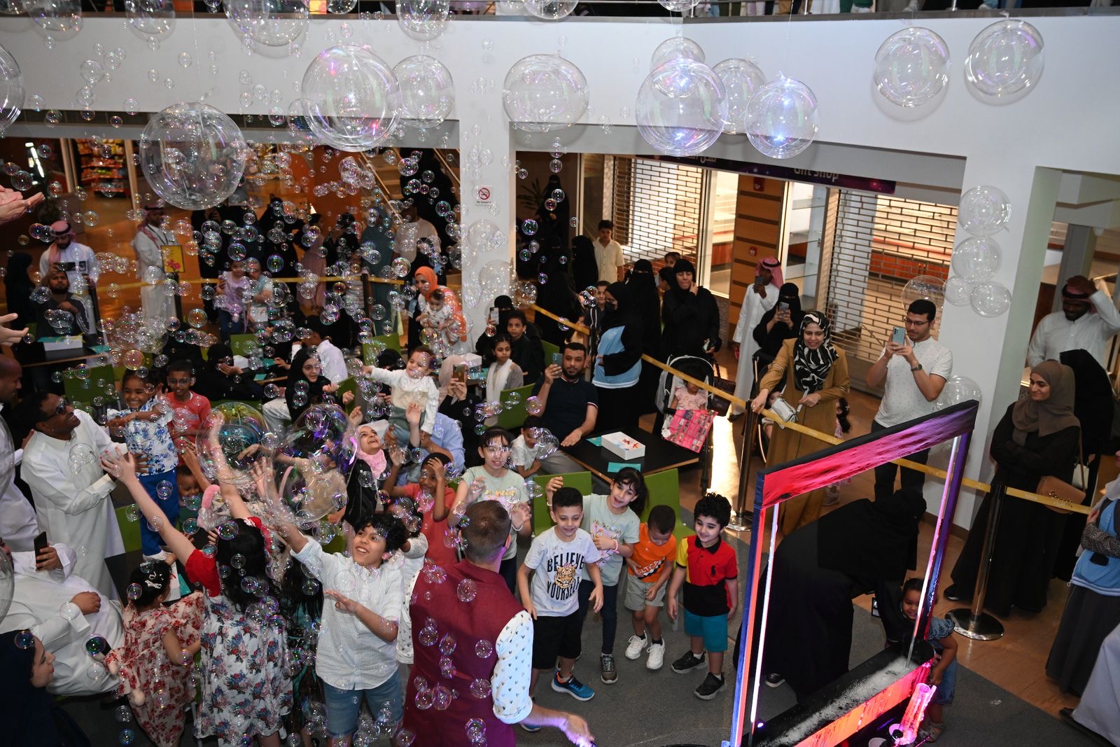 ولم تخلُ فعاليات مركز إثراء من فقاعات المرح والفرح، حيث اصطفمئات الأطفال وسط معرض الطاقة لخوض تجربة "فقاعات الصابون"، فيما ينشغل آخرون بورشة عمل لصناعة زينة العيد على أن يحصلوا جميع المشاركين على زينة حيوية تنبض بألوان ممزوجة، ومع اختتام فعاليات العيد أحيت الفرق أنشطة وبرامج العيد بتوهج وتصفيق حار من الحضور الذين وجدوا ضآلتهم في كافة مرافق المركز.