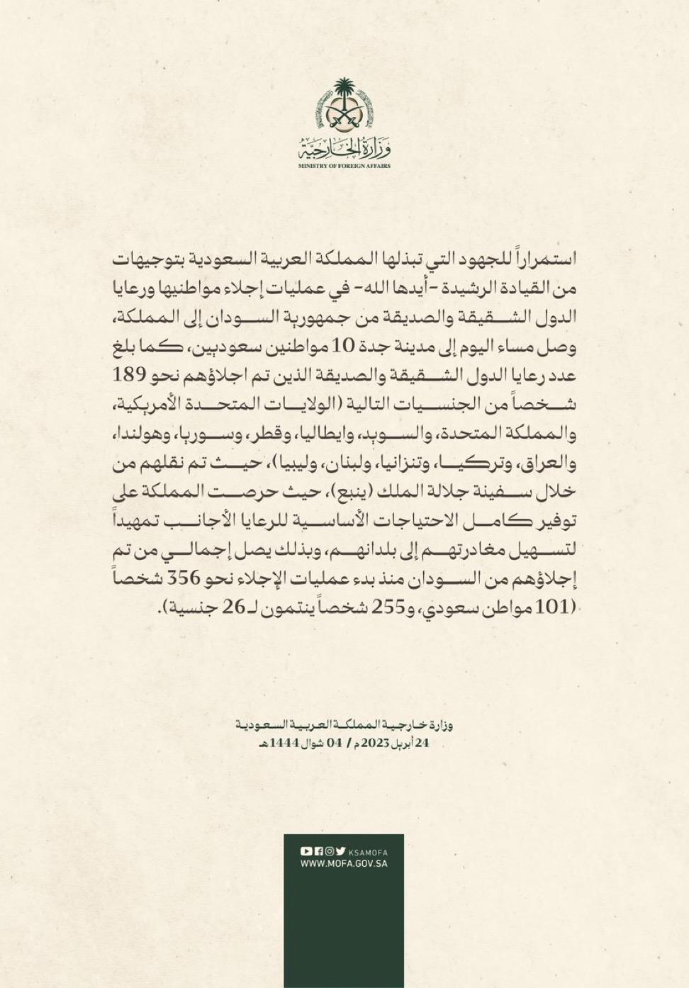 وصول 10 مواطنين و189 شخصاً من رعايا عدد من الدول الشقيقة والصديقة إلى جدة بعد عملية إجلائهم من السودان من خلال سفينة جلالة الملك "ينبع".