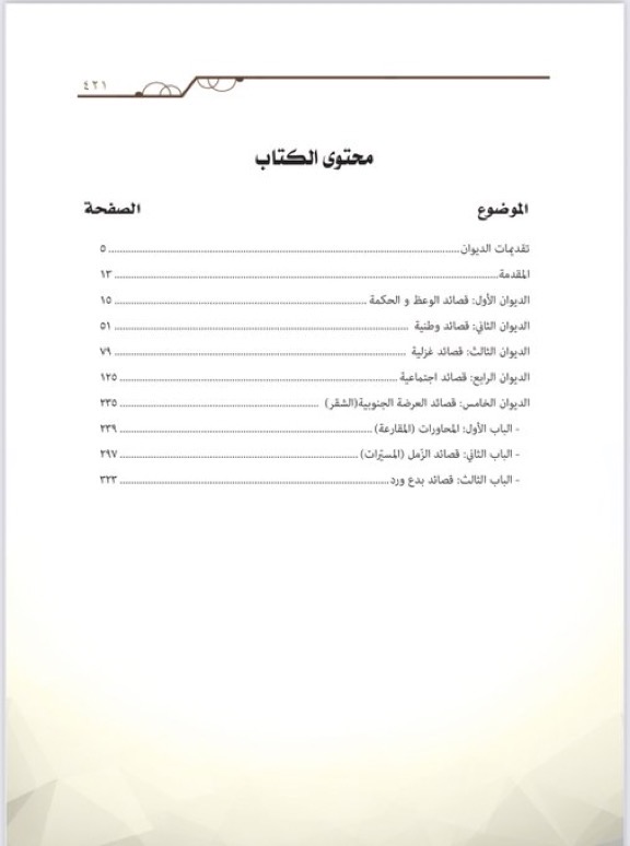 وتضم بين جنباتها خمس دواوين في مجلد واحد وتتناول الأربعة دواوين الأولى الشعر العمودي أو  شعر  النظم  ، وقد تم تقسيمها إلى ( ديوان الوعظ والحكمة ، وديوان القصائد الوطنية ، وديوان القصائد الغزلية وكذلك ديوان القصائد الإجتماعية)،أما الديوان الخامس والأخير عن أشعار العرضة الجنوبية .