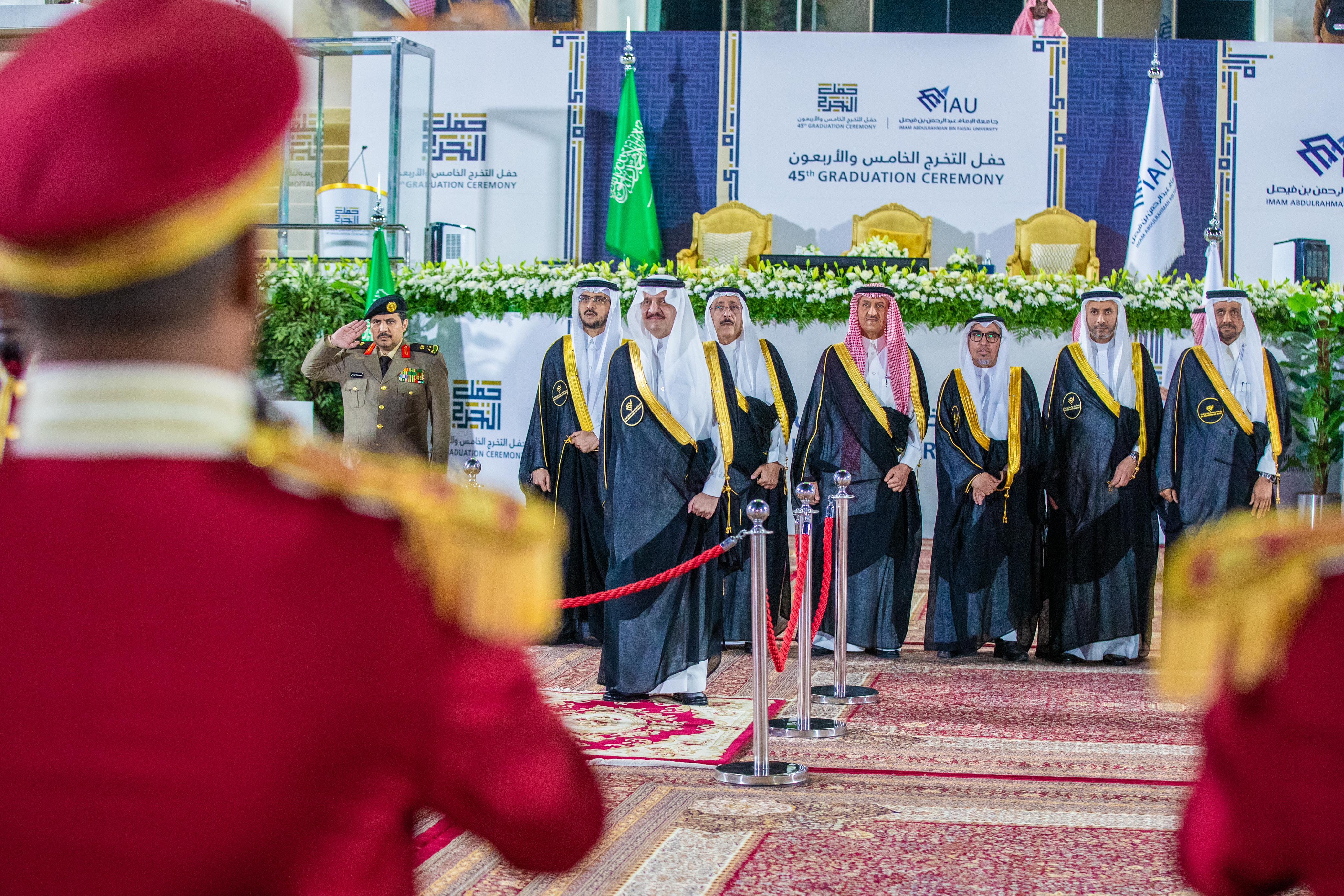 رعى صاحب السمو الملكي  الأمير سعود بن نايف بن عبد العزيز  أمير المنطقة الشرقية احتفال  جامعة الإمام عبدالرحمن بن فيصل بالدمام  بتخريج 7784 طالباً وطالبة يمثلون الدفعة الخامسة والأربعين من الخريجين والخريجات المتوقع تخرجهم لمراحل الدراسات العليا، والبكالوريوس والدبلوم وذلك في الأستاد الرياضي بالجامعة امس الثلاثاء بحضور معالي رئيس الجامعة الأستاذ الدكتور عبدالله بن محمد الربيش وأصحاب المعالي وضيوف الجامعة وأولياء الأمور .