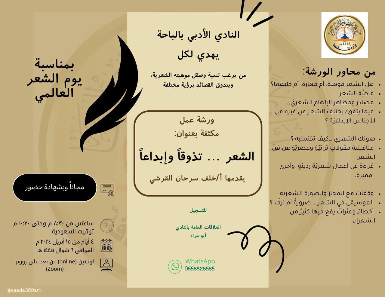 في أجواء تفاعلية مميزة، استضاف النادي الأدبي بالباحة ورشة عمل استثنائية تحت عنوان "الشعر... تذوقًا وإبداعًا"، والتي قدمها الأستاذ خلف بن سرحان القرشي، وهدفها تعميق الوعي بجماليات الشعر وأسس كتابته.