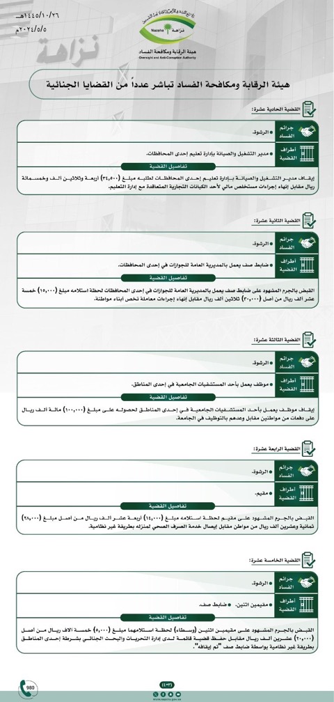 صرّح المتحدث الرسمي في هيئة الرقابة ومكافحة الفساد بأن الهيئة باشرت عدداً من القضايا الجنائية خلال الفترة الماضية، وجارٍ استكمال الإجراءات النظامية بحق مرتكبيها، وكانت