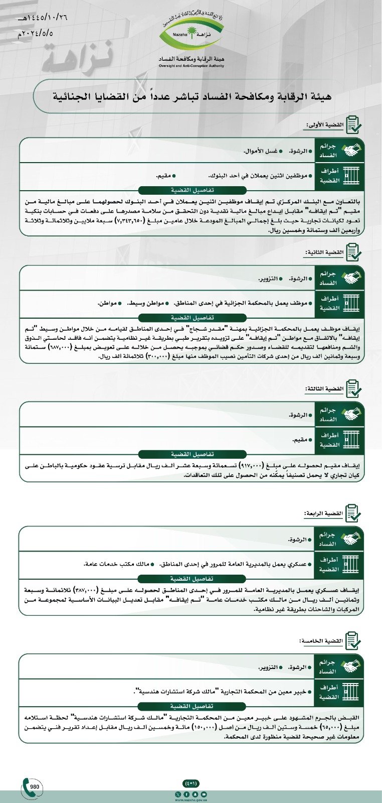 القبض بالجرم المشهود على موظف يعمل ببلدية إحدى المحافظات لحظة استلامه مبلغ (1.500) ألف وخمسمائة ريال مقابل إصدار تقرير فني من البلدية لعقار بطريقة غير نظامية يمكّن مالك