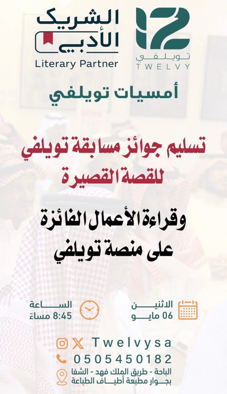 يضرب عشاق وزوار مقهى تويلفي بالباحة بالتعاون مع الشريك الأدبي، موعدًا مع عدة فعاليات هذا الأسبوع، حيث تتمثل الأمسية الأولى في تسليم جوائز مسابقة تويلفي للقصة القصيرة، وقراءة الأعمال الفائزة على منصة تويلفي، وذلك يوم الاثنين 6 مايو الجاري في تمام الساعة التاسعة إلا الربع مساءً..