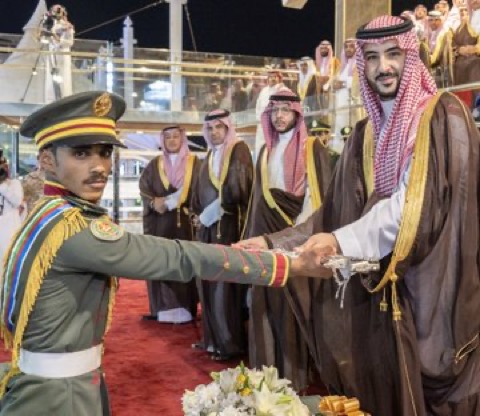 بعد ذلك جرى العرض العسكري وألقى الطلبة نشيد الكلية، وسُلّمت راية الكلية، وأدى الخريجون القسم، ثم أُعلنت النتائج، وكرَّم سمو وزير الدفاع الطلبة المتفوقين، وتسلَّم سموه هدية تذكارية من قائد الكلية بهذه المناسبة.