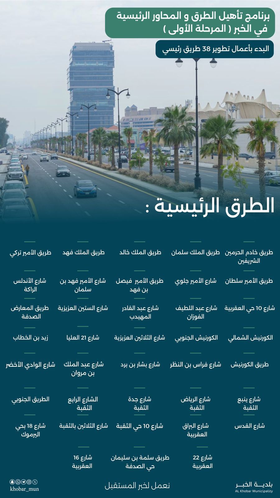استمراراً لجهود أمانة المنطقة الشرقية، لتحسين المشهد الحضري، وبرامج أنسنة المدن، وجودة الحياة، بالمنطقة، من خلال تطوير الطرق المحورية والرئيسية، أطلقت بلدية محافظة الخبر المرحلة الأولى لبرنامج تطوير الطرق المحورية والرئيسية في الخبر بطول إجمالي يزيد عن 85,500 كم مما سيكون له دور كبير في تحسين أداء شبكة الطرق ورفع مستوى السلامة المرورية بالشكل الذي يتطابق مع معايير السلامة العالمية.