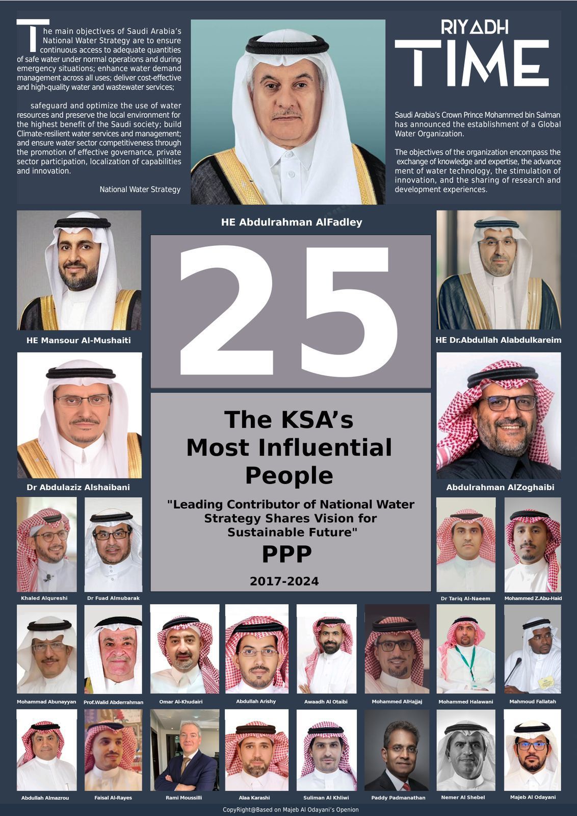 من جانبٍ آخر نشرت مجلة Riyadh Time المتخصصة في قطاع تقنية المياه قائمة بأبرز ٢٥ شخصية مؤثرة عملت في السنوات الماضية في قطاع تقنية المياه، وتضم هذه القائمة معالي المهندس عبدالرحمن الفضلي وزير البيئة و المياه و الزراعة، ومعالي نائب الوزير لوزارة البيئة والمياه و الزراعة منصور المشيطي، ومعالي محافظ التحلية د عبدالله العبدالكريم ، وخالد القريشي الرئيس التنفيذي لشركة السعودية لشركات المياة، والمهندس معجب العضياني الرئيس التنفيذي لشركة بيورجي المحدودة. وقد أشارت المجلة أنه في عام 2017، تم الإعلان عن الاستراتيجية الوطنية السعودية للمياه 2030 بهدف العمل على معالجة جميع التحديات الرئيسية، والاستفادة من الدراسات السابقة والمستمرة، وإصلاح قطاع المياه والصرف الصحي لضمان التنمية المستدامة للموارد المائية في المملكة مع توفير خدمات عالية الجودة بأسعار معقولة، وامتداداً لتوجيهات القيادة في المملكة العربية السعودية حققت الاستراتيجية الوطنية للمياه واستدامتها نجاحاً واسعاً في كافة المجالات والانشطة لتحقيق تميز عالمي في هذا القطاع، وبناءً على هذا يتطلع المهتمون بهذا المجال لتطبيق هذه الإستراتيجية بدول والوطن العربي للنهوض بمواردنا المائية والمحافظة عليها لأجيالنا القادمة.