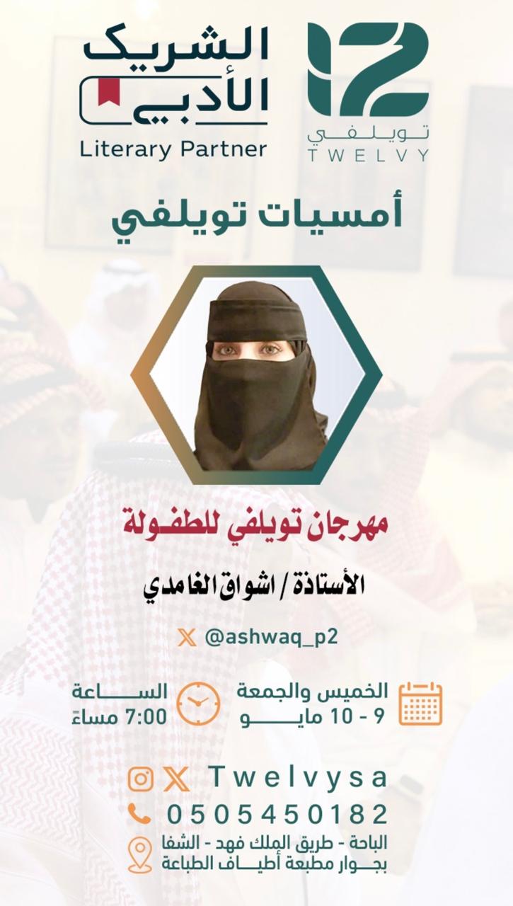 كما يستضيف المقهى والشريك الأدبي، وعلى مدار اليومين ذاتهم، مهرجان" تويلفي للطفولة"، تقيمه الأستاذة أشواق الغامدي، وذلك في تمام الساعة السابعة مساء.