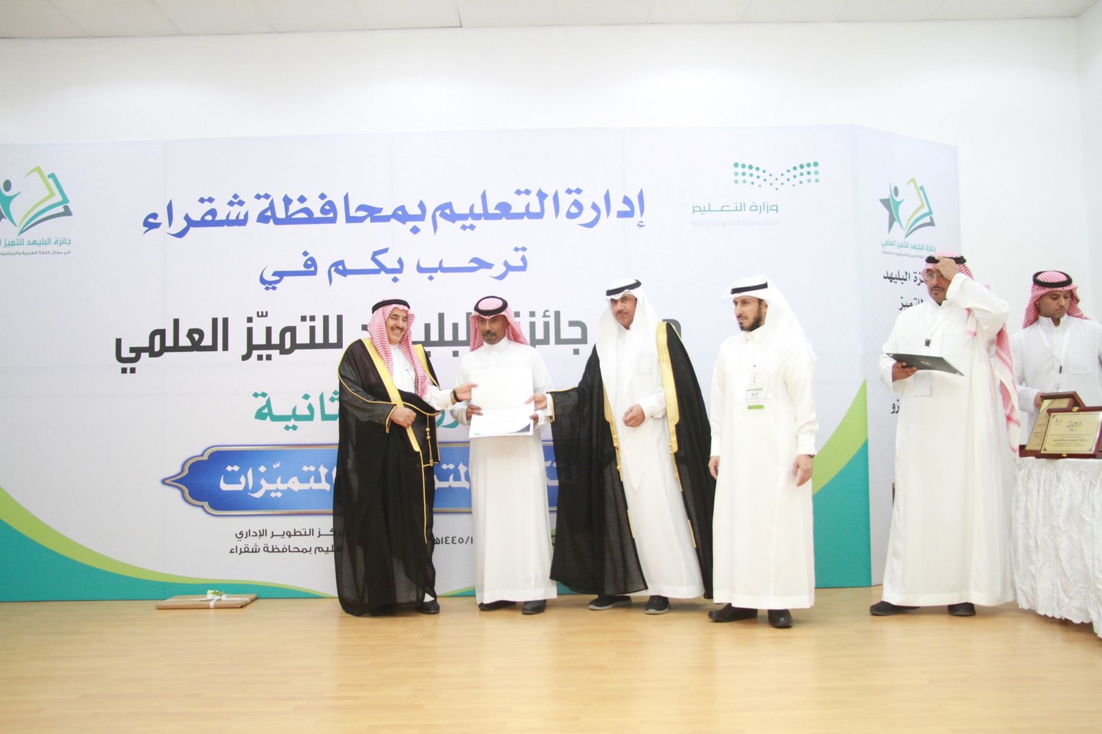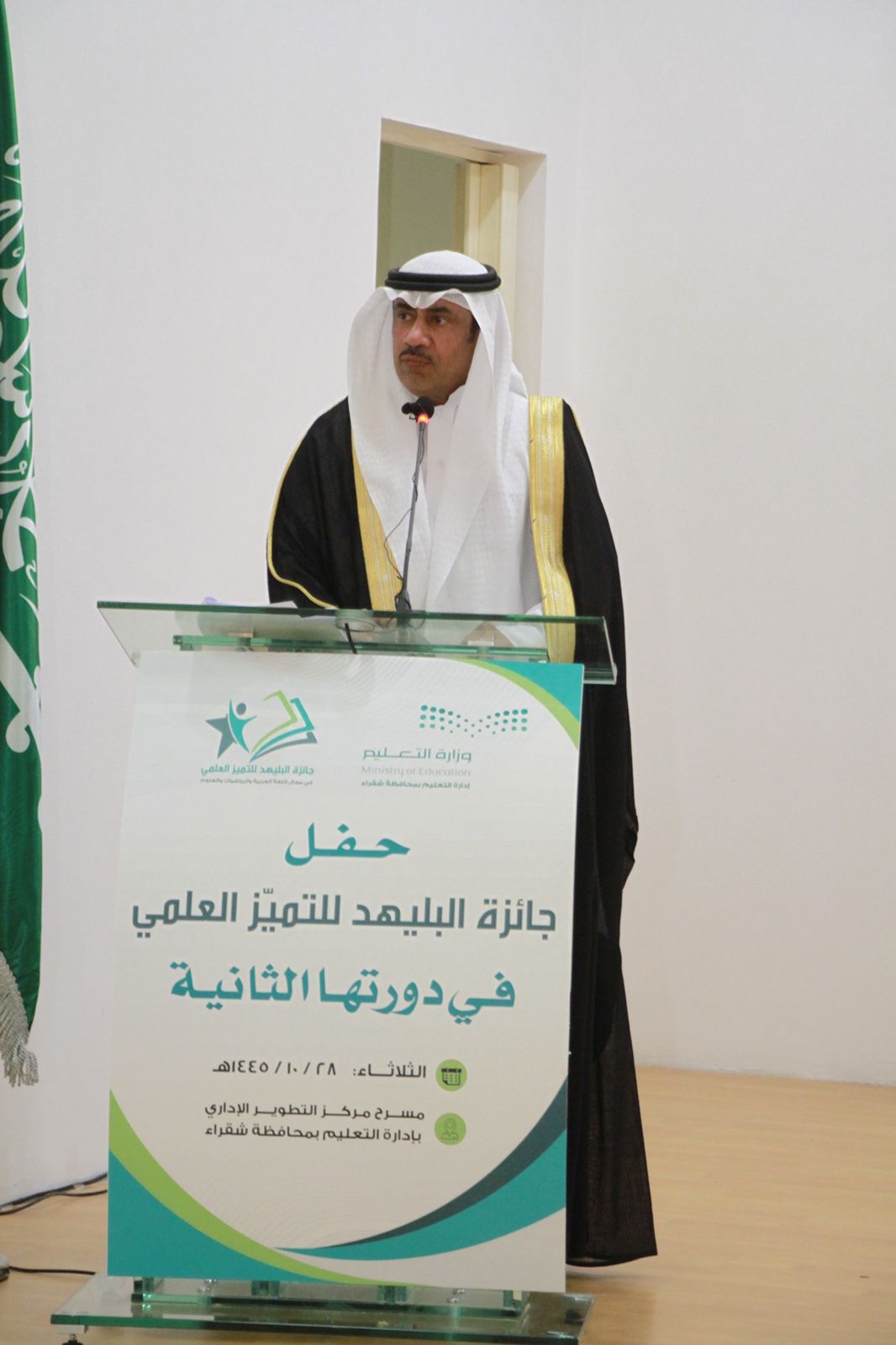 برعاية وتشريف رجل الأعمال عمر بن سعود البليهد ، أقامت أمانة جائزة البليهد للتميز العلمي بإدارة التعليم بشقراء الحفل الختامي للدورة الثانية للجائزة، يوم الثلاثاء 28/10/1445 هـ على مسرح مركز التطوير الإداري بشقراء .