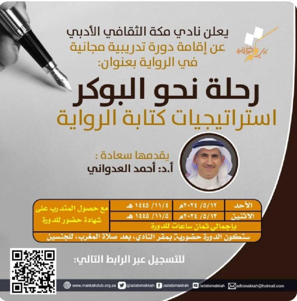 أختتمت دورة تدريبية مجانية عن كتابة الرواية بعنوان: "رحلة نحو  البوكر  إستراتيجيات كتابة الرواية"والتي اقامها  نادي مكة الثقافي الأدبي  بأحد قاعات فندق فور بونيتس ليومي الأحد والإثنين ١٢ - ١٣ من شهر مايو الحالي والتي حاضر فيها الدكتور أحمد العدواني أستاذ النقد الأدب الحديث بجامعة أم القرى تخصص السرديات الحديثة وحضرها مايقارب الثلاثون متدرب ومتدربة من الجنسين وأبدع فيها الدكتور أحمد في الشرح والتفصيل عن العوامل التي تخلق لنا رواية مشوقه وتحترم ذائقة المتلقي القارئ وهي: