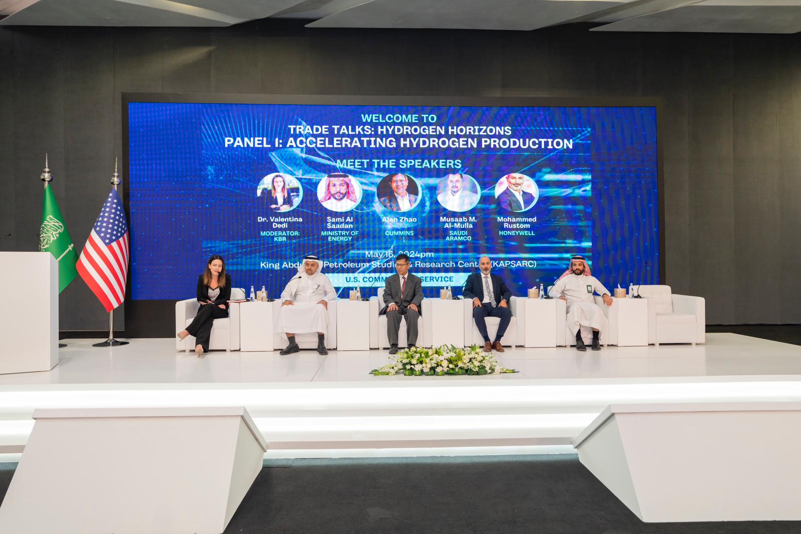 نظم القسم التجاري بالقنصلية الأمريكية بالظهران وسفارة الولايات المتحدة الأمريكية في الرياض بالتعاون مع وزارة الطاقة ومركز الملك عبد الله للدراسات والبحوث البترولية (كابسارك) يوم 16 مايو برنامج حوار بعنوان “المحادثات التجارية: آفاق الهيدروجين – نحو تعزيز تحوّل الطاقة في عالم اليوم”، وهو برنامج يركّز على تقنيات الهيدروجين. وانضم الى البرنامج عدد من المتحدثين من وزارة الطاقة السعودية، وشركة أرامكو السعودية، وشركة سابك، وشركة نيوم للهيدروجين الأخضر، وشركة “إنوا”، والشركات الرائدة في هذا القطاع مثل “إير برودكتس قدرة” (Air Products Qudra)، و”-كومينز” (Cummins)، و”إكسون موبيل” (ExxonMobil)، و”هانيويل” (Honeywell).