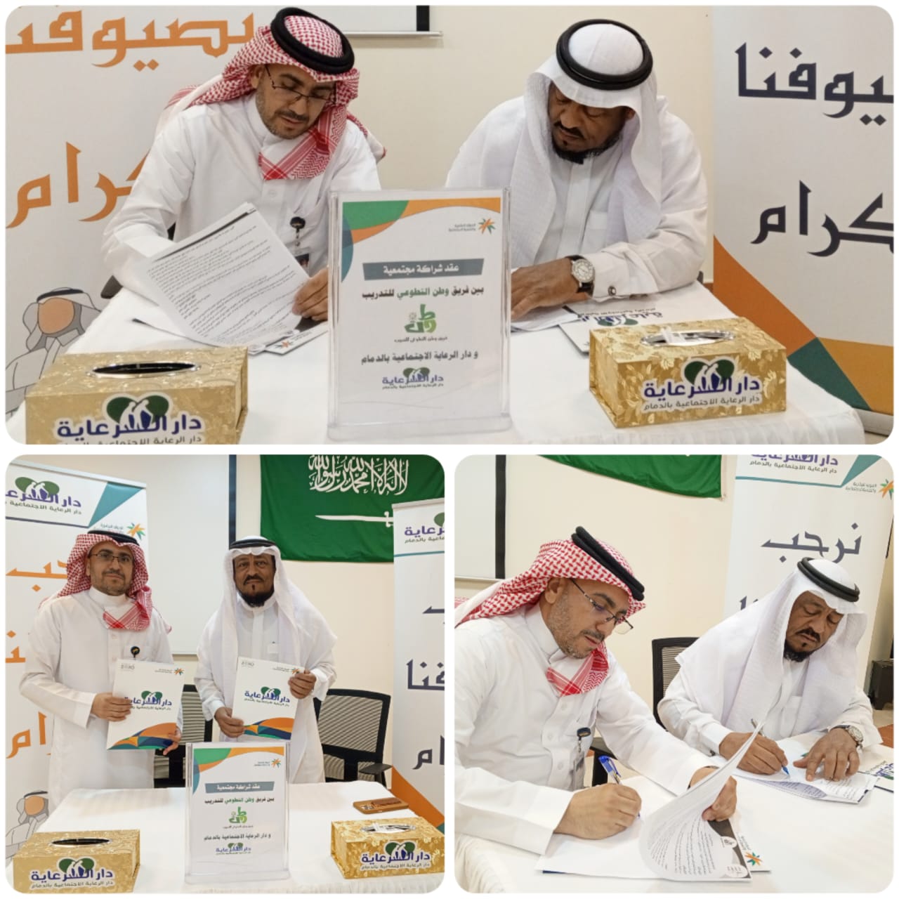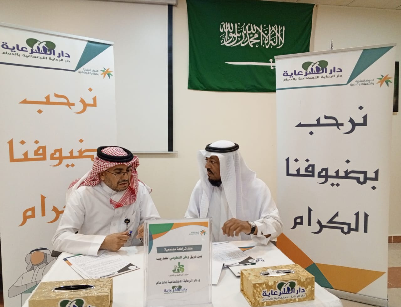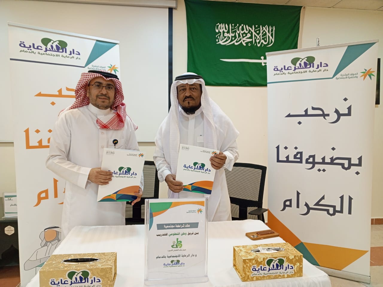 عقدت إدارة  دار الرعاية الإجتماعية بالدمام  التابعة لفرع وزارة الموارد البشرية والتنمية الاجتماعية بالمنطقة الشرقية، يوم الإثنين 12 ذو القعدة الموافق 20 مايو شراكة مجتمعية مع فريق " وطن التطوعي" للتدريب المعتمد بمحافظة الأحساء. ووقعت الشراكة، بحضور مدير الدار الأستاذ راضي العنزي وممثل الفريق التطوعي الأستاذ خالد بن مبارك المنصور، وبحضور مشرفين قسم العلاقات العامة وقسم التدريب والتطوير والقسم الاجتماعي وبعض منسوبي الدار. وأوضح "العنزي" قد أبرمت الشراكة بهدف إخراج وتنفيذ عدة برامج تدريبية وورش العمل والدورات التدريبية المتخصصة باختيار عناوين تخدم المنسوبين والمعتمدة كذلك، والتي تتنوع بين الإدارية والتقنية