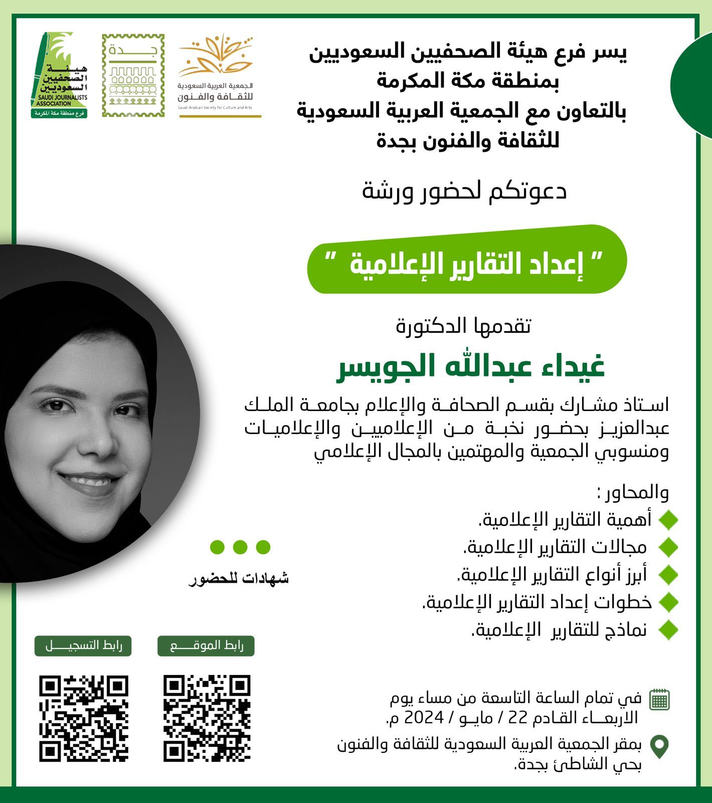 ينظم فرع هيئة الصحفيين السعوديين بمنطقة مكة المكرمة بالتعاون مع الجمعية العربية السعودية للثقافة والفنون بجدة ورشة "إعداد التقارير الإعلامية"، في تمام الساعة التاسعة من مساء يوم غد الأربعاء 22 / مايو / 2024 م.