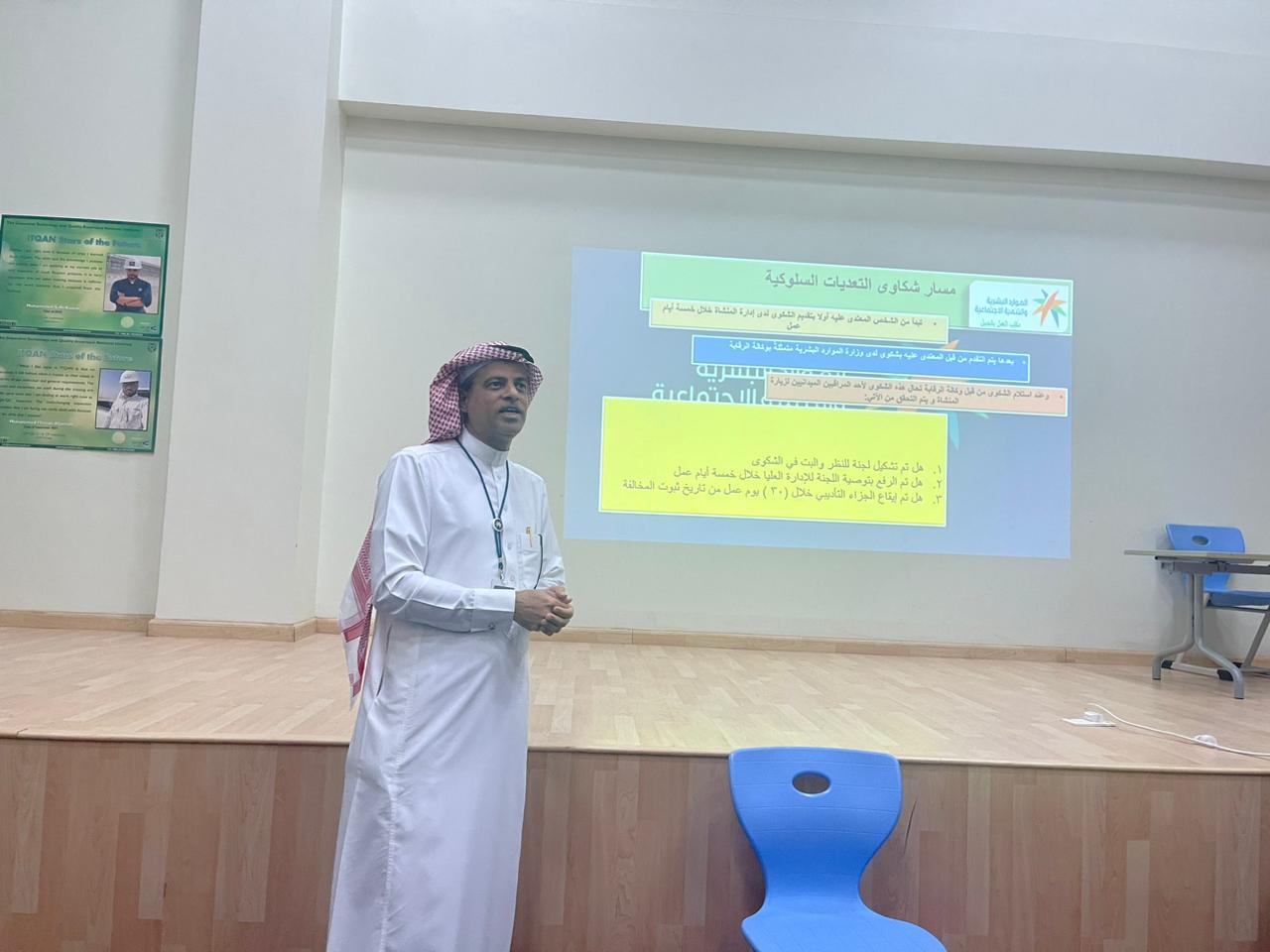 أقام مكتب عمل الجبيل متمثلا بقسم الرقابة وبالتعاون مع معهد اتقان بالجعيمة لقاء تعريفي بعنوان ضوابط الحماية من التعديات السلوكية في بيئة العمل بحضور ممثل المكتب من قسم الرقابة حسين بن عبد الله ال قاسم.