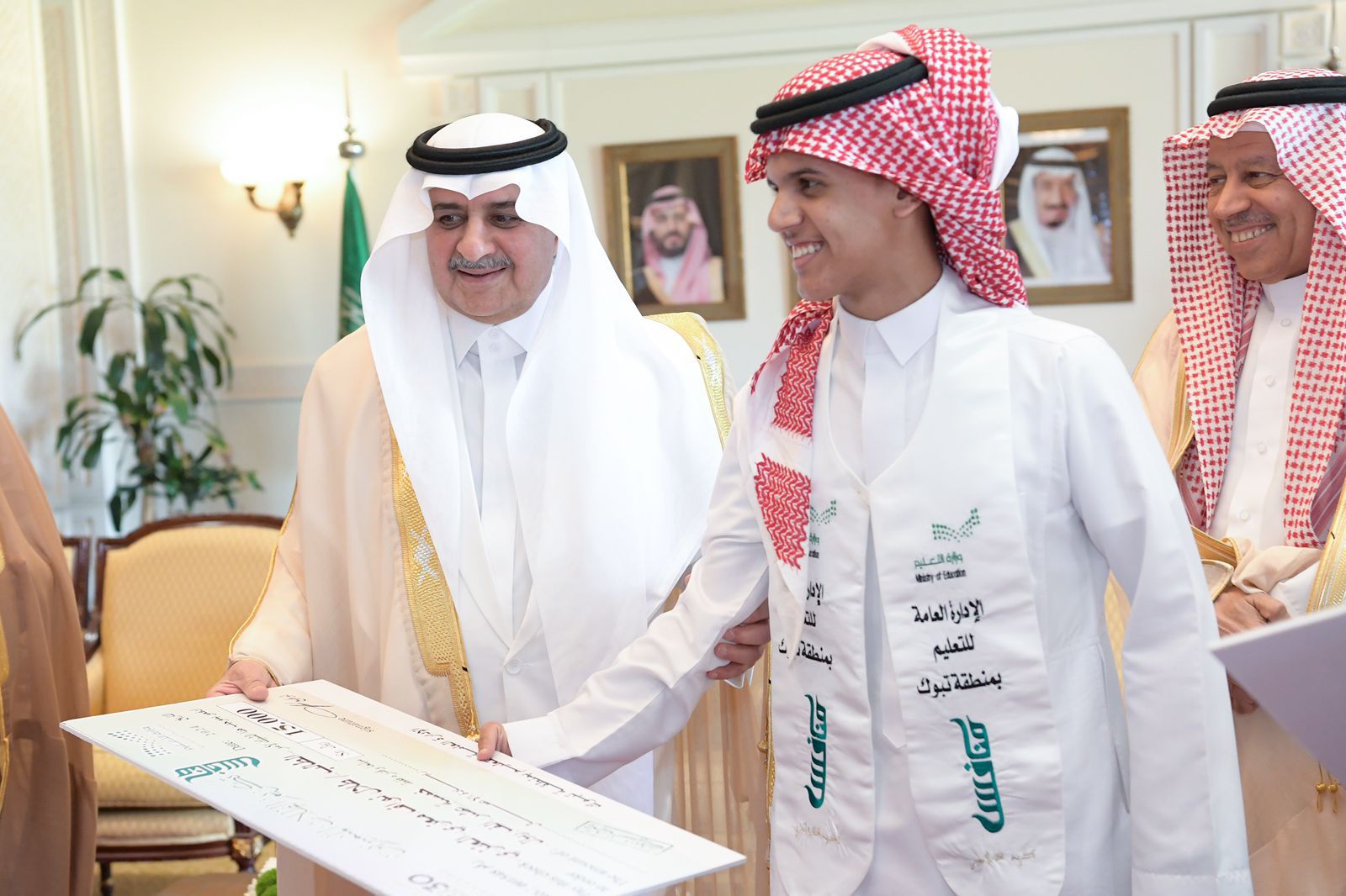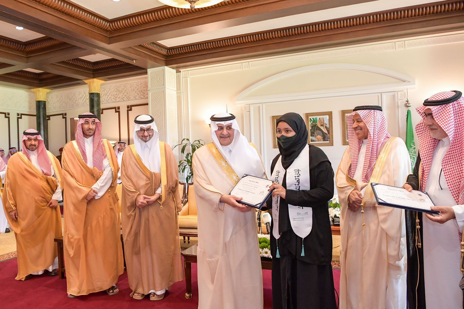 كرم صاحب السمو الملكي الأمير فهد بن سلطان بن عبدالعزيز أمير منطقة تبوك، بحضور صاحب السمو الملكي الأمير خالد بن سعود بن عبدالله الفيصل نائب أمير المنطقة, في ديوان الإمارة اليوم، الطلاب والطالبات من مدارس التعليم بالمنطقة الحاصلين على المراكز الأولى على مستوى المملكة في المسابقات المحلية والعالمية للعام 1445هـ. وتضمن التكريم الفائزين بجائزة الأميرة صيتة بنت عبدالعزيز للتميز في العمل الاجتماعي، والطلاب والطالبات المتميزين بمسابقة منافس، وفي الاولمبياد الوطني للبرمجة والذكاء الاصطناعي، وبجائزة الشيخ محمد بن صالح بن سلطان، اضافة لمسابقات ريادة الأعمال، وراوي الدرعية، والكانجارو، وفي المسابقات الرياضية. وهنأ سموّه الفائزين بهذه الجوائز ، متمنياً لهم التوفيق ومواصلة التميز والتفوق والنجاح ، وقال سموه : في هذا اليوم المبارك يشرفني أن أكون متواجد في حفل يحمل اسم والدتي ووالدة الجميع الأميرة صيتة بنت عبد العزيز وهي إمراه استثنائية ونحن نعرف كعائلة أنها كانت والدة وموجهة للجميع ولا أعلم أكثر منها سيدة تحب الخير وتحب عمل الخير وتكافئ على من يعمل عمل الخير , مضيفاً سموه و بانه شرف كبير لي أن أحضر هذه المناسبة التي تحمل اسمها -رحمها الله- وسعيد بوجود الأحفاد في هذا المكان وعلى كل حال مهما قيل عن جهود الأميرة صيتة - رحمها الله - لبلادها وللأسرة السعودية يعجز الإنسان أن يتحدث عن ما عملته وما قامت به -رحمها الله- مشيدا سموه بدور جائزة الاميرة صيتة بنت عبدالعزيز في تحفيز المبدعين في جميع مناطق المملكة , ومتمنياً سموه للفائزين أن تكون هذه الجوائز حافزاً لزملائهم وزميلاتهم بأن يحصلون عليها في الأعوام القادمة مقدما سموه شكره لإخوانه وابنائه اصحاب السمو الأمراء ، حضر حفل التكريم ، صاحب السمو الأمير سعود بن فهد بن عبدالله بن سعود الكبير عضو مجلس الأمناء لجائزة الأميرة صيتة بنت عبد العزيز للتميز في العمل الاجتماعي نائب اللجنة التنفيذية , وصاحب السمو الأمير سلمان بن محمد بن سلمان بن محمد آل سعود عضو مجلس الأمناء عضو اللجنة التنفيذية لجائزة الأميرة صيتة بنت عبد العزيز للتميز في العمل الاجتماعي والدكتور فهد بن حمد المغلوث الأمين العام للجائزة ، ومدير عام التعليم بالمنطقة ماجد بن عبدالرحمن القعير