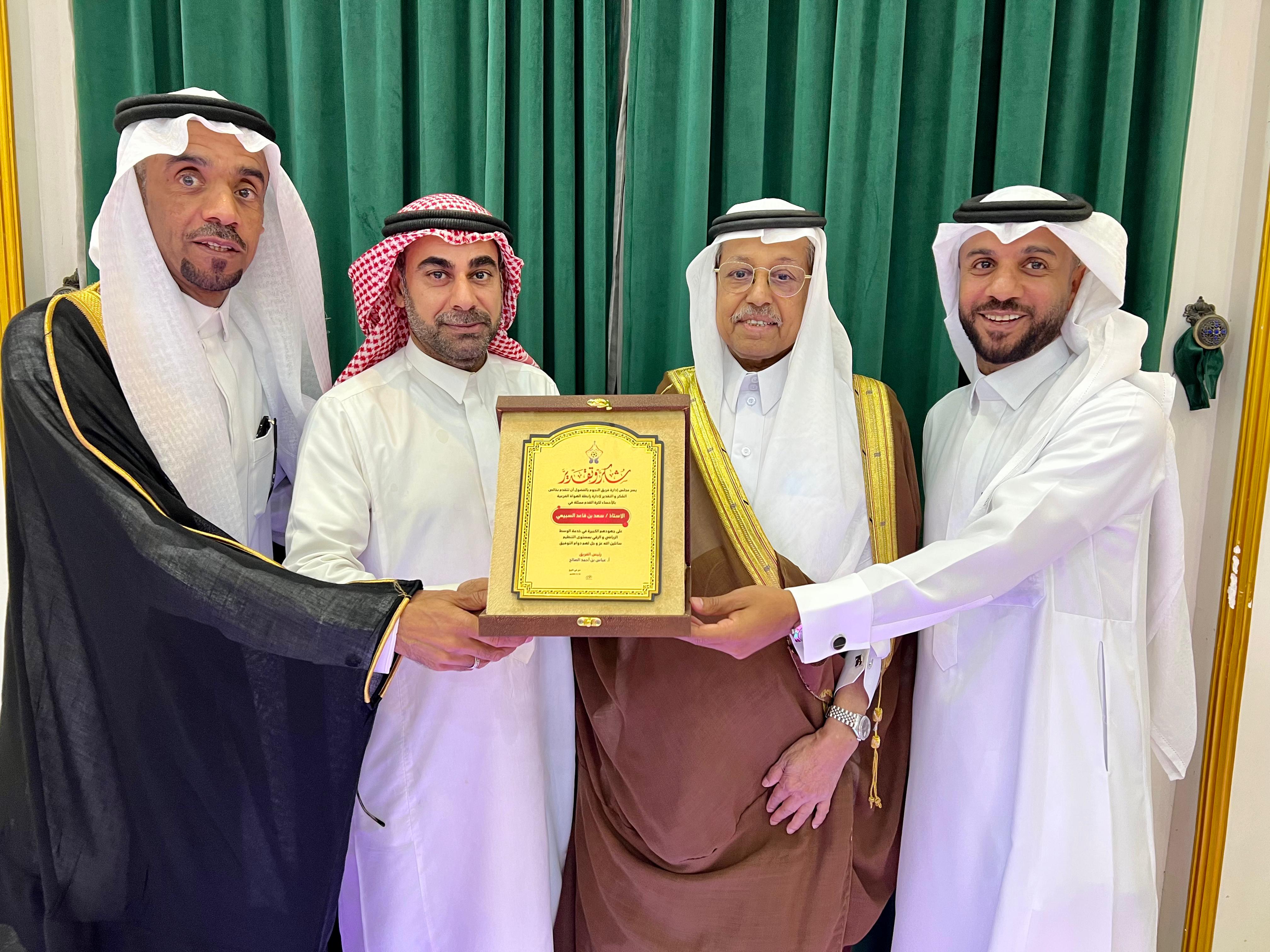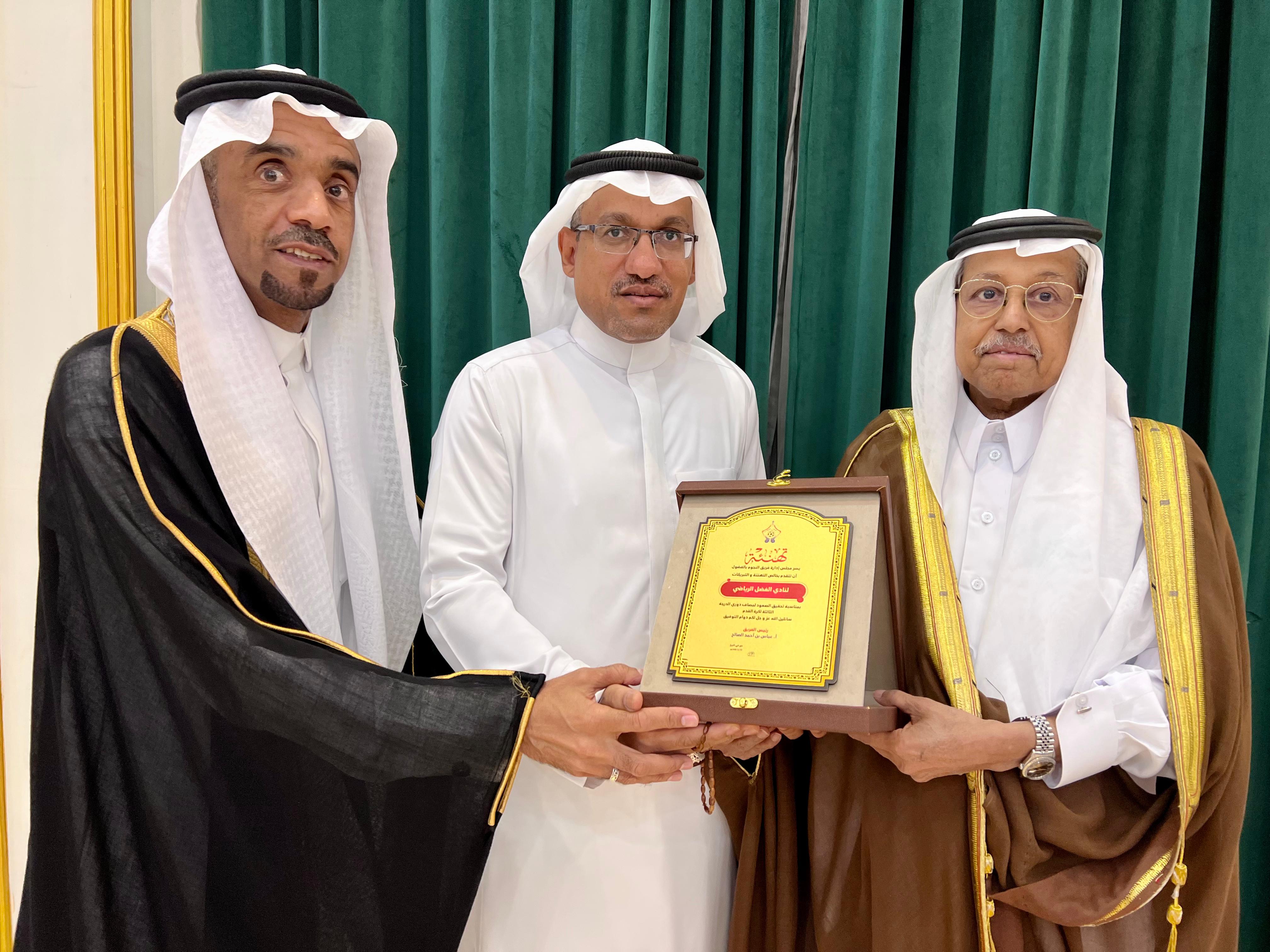 كما تم تقديم تهنئة لنادي الفضل بمناسبة صعودهم الى دوري الدرجة الثالثة و كذلك تهنئة أخرى لشيخ المعلقين الأستاذ حبيب العساكر، لإنضمامه إلى قناة الرياضية السعودية ، كما كانت وقفة مميزة من الإدارة لإبن الفريق البار المدرب سلمان بن معتوق الصالح، نظير تضحياته و مساهمته في تحقيق الكثير من الانجازات ، بعدها تم تكريم سناب " ياحلو حوارينا " للإعلامي محمد الدالوي، و الإعلامي أحمد النجار، لتميزهم في تغطية الأحداث الرياضية ، وتكريم إدارة رابطة الهواة الفرعية لكرة القدم بالأحساء ممثلةً برئيسها الأستاذ سعد بن قاعد السبيعي، قبل أن يتم التقاط الصور الجماعية و التفضل على وجبة العشاء التي أعدتها إدارة الفريق لجميع الحاضرين .